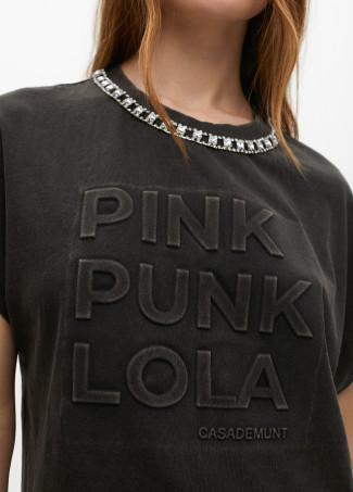 Camiseta de manga corta con tejido lavado y detalle de joyas en el cuello. Diseño con inscripción en relieve en el frente. Ideal para dar un toque sofisticado a cualquier conjunto diario. Confeccionada en materiales de alta calidad para asegurar comodidad.