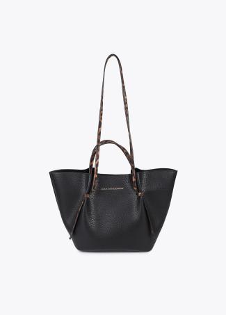 Bolso mini shopper confeccionado en material sintético con efecto piel y detalles de animal print. Compartimento interior con cremallera y cierre magnético. Correas ajustables para mayor comodidad.