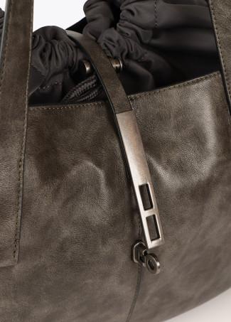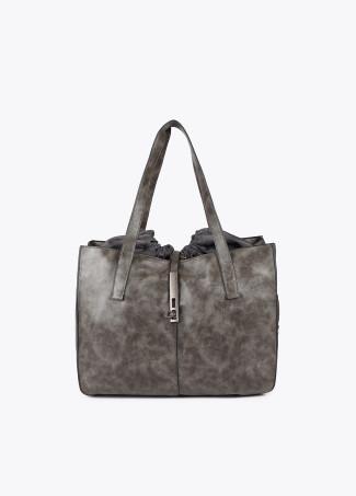 Bolso shopper de efecto piel desgastado con detalle de cadena en los laterales. Amplio interior con cierre de cordón y asas reforzadas para mayor comodidad. Acabado en tono gris envejecido.
