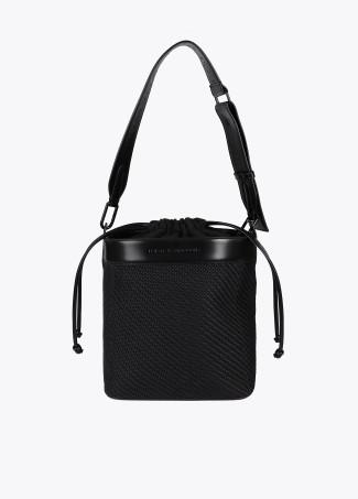 Práctico bolso hobo que combina tejido texturizado con detalles en efecto piel. Cuenta con cierre ajustable y correa de hombro con logotipo grabado. Ideal para llevar todo lo esencial con estilo.