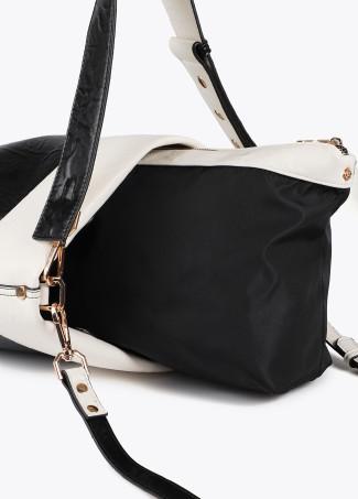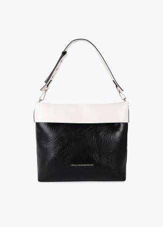 Bolso hobo elegante con efecto piel arrugada y diseño bicolor en negro y blanco. Incluye un asa ajustable y detalles metálicos dorados. Cierre superior con cremallera y forro interior amplio para mayor funcionalidad.