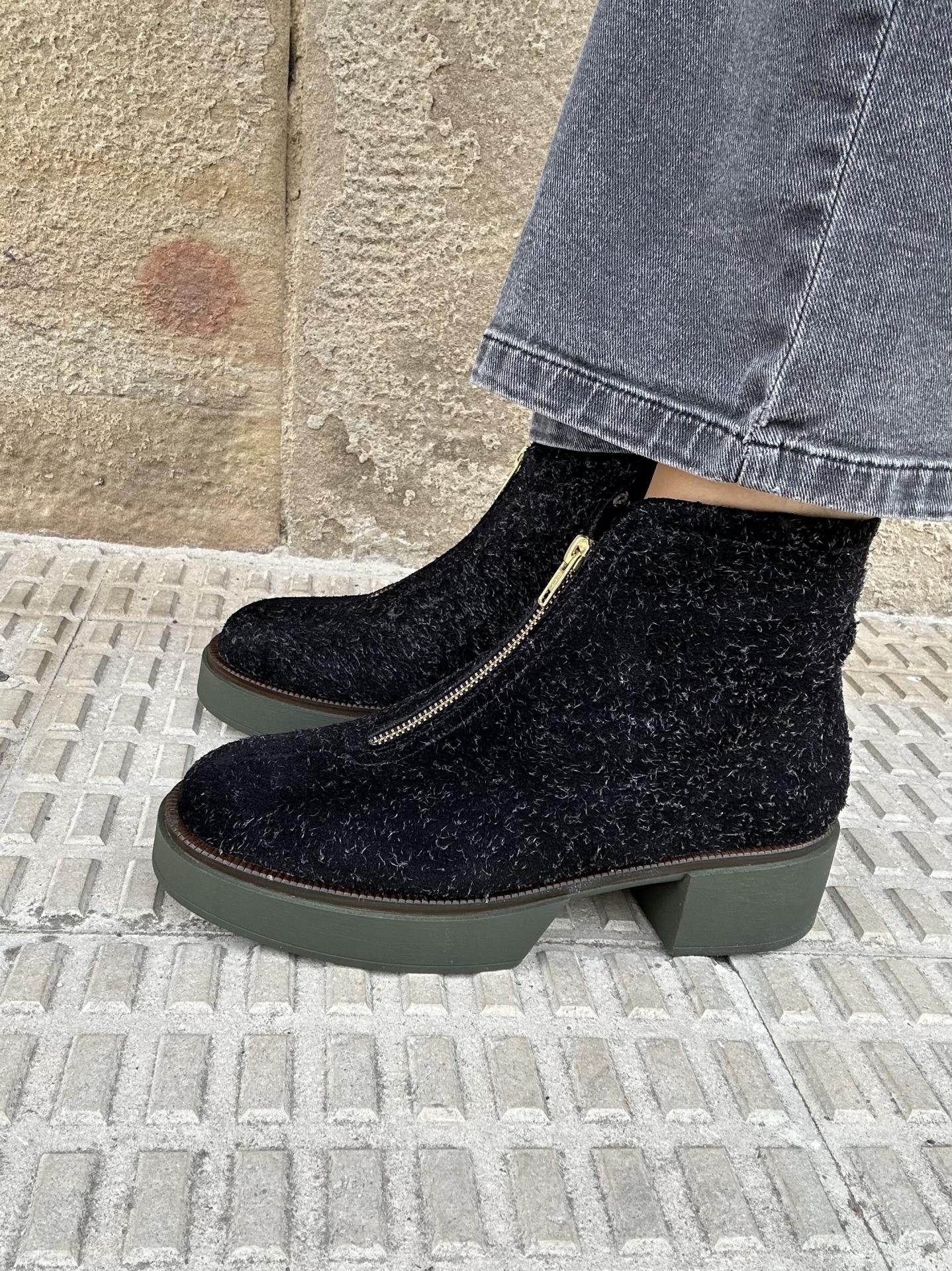 Botín con tacón y plataforma elaborado en tejido afelpado color negro. Cierre con cremallera en la parte frontal Tacón ancho de 5 cm de altura y 3 cm de plataforma. Suela de goma original en contraste en color verde.