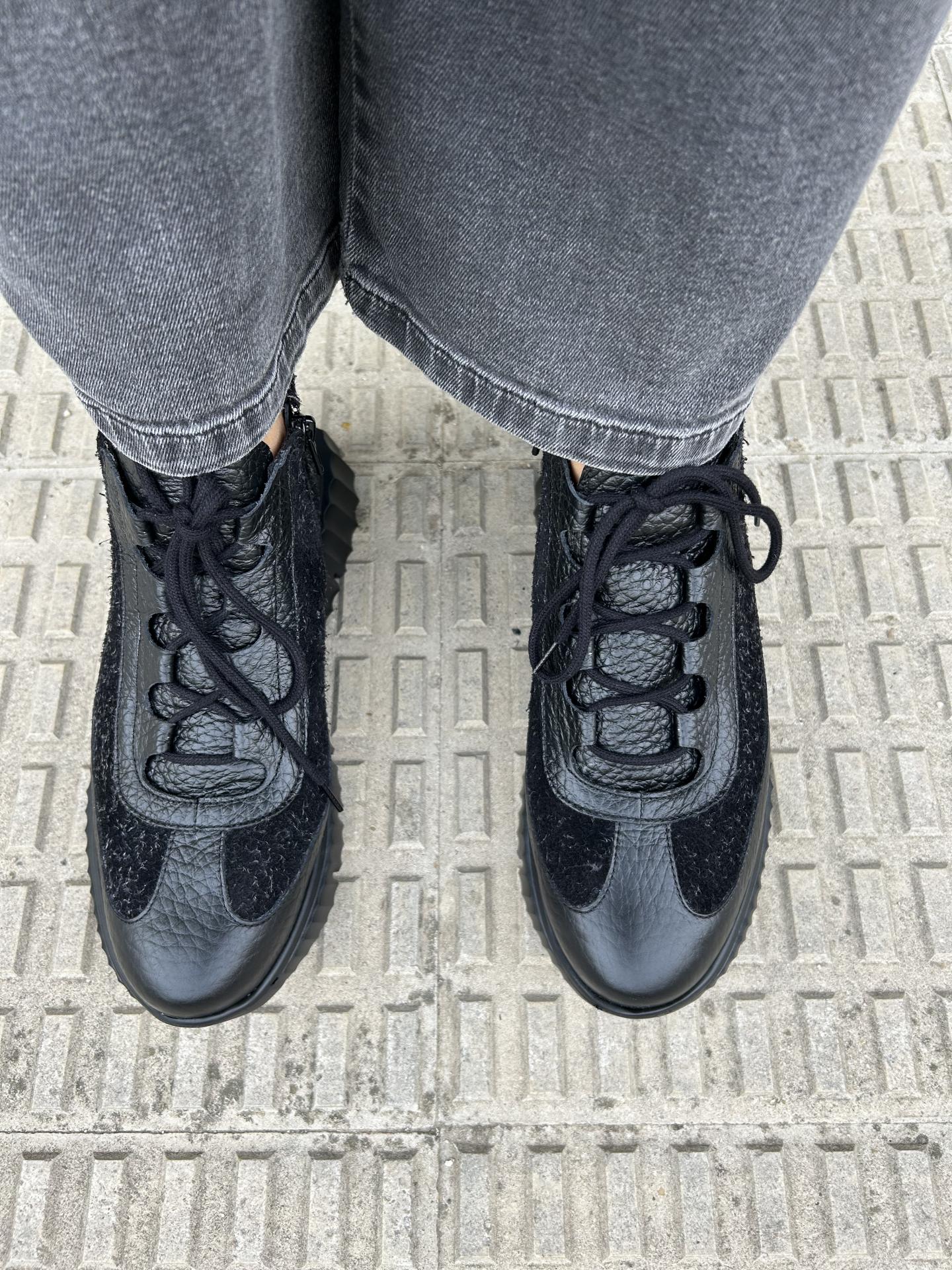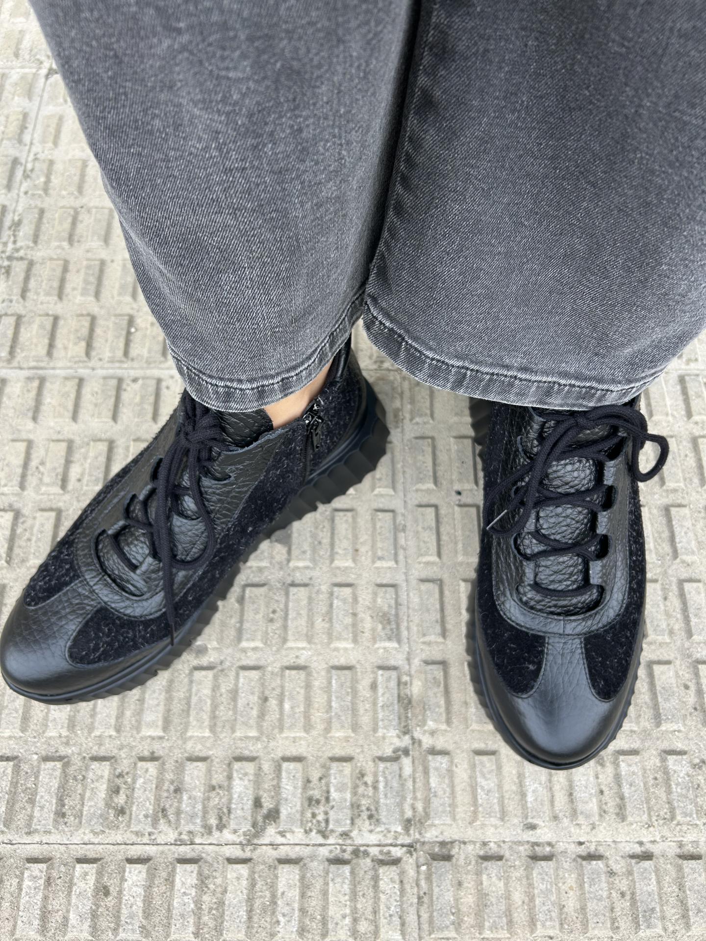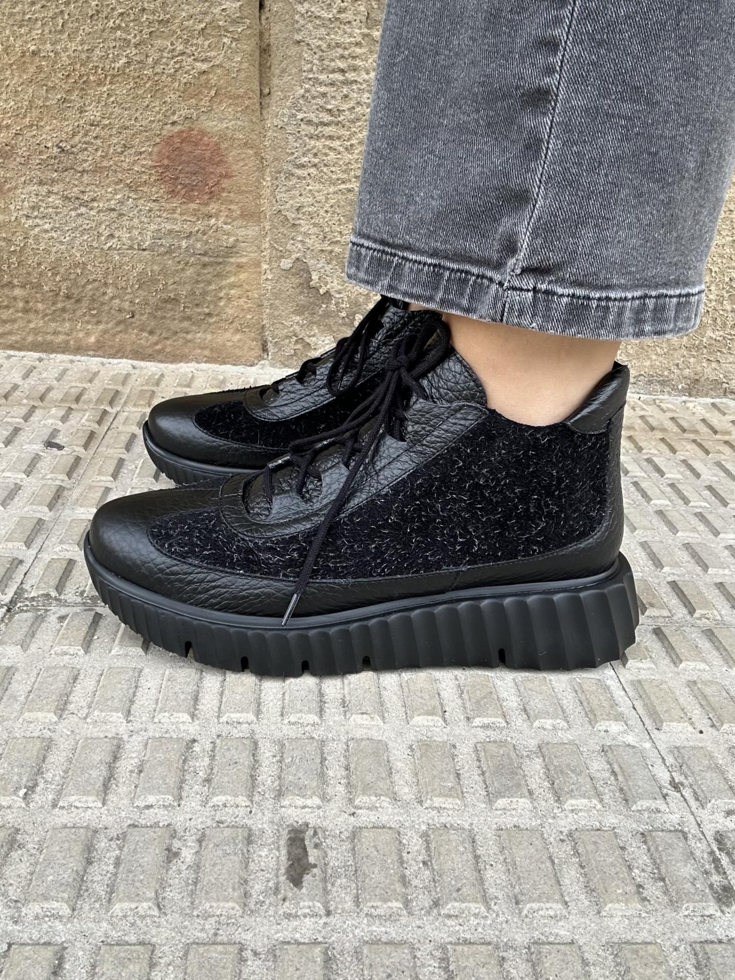 Botín sport estilo deportivo con cordones elaborado en piel y tejido afelpado color negro. Cierre con cremallera en el interior. Plataforma extralight de 4 cm de altura y 2 cm en la parte delantera.