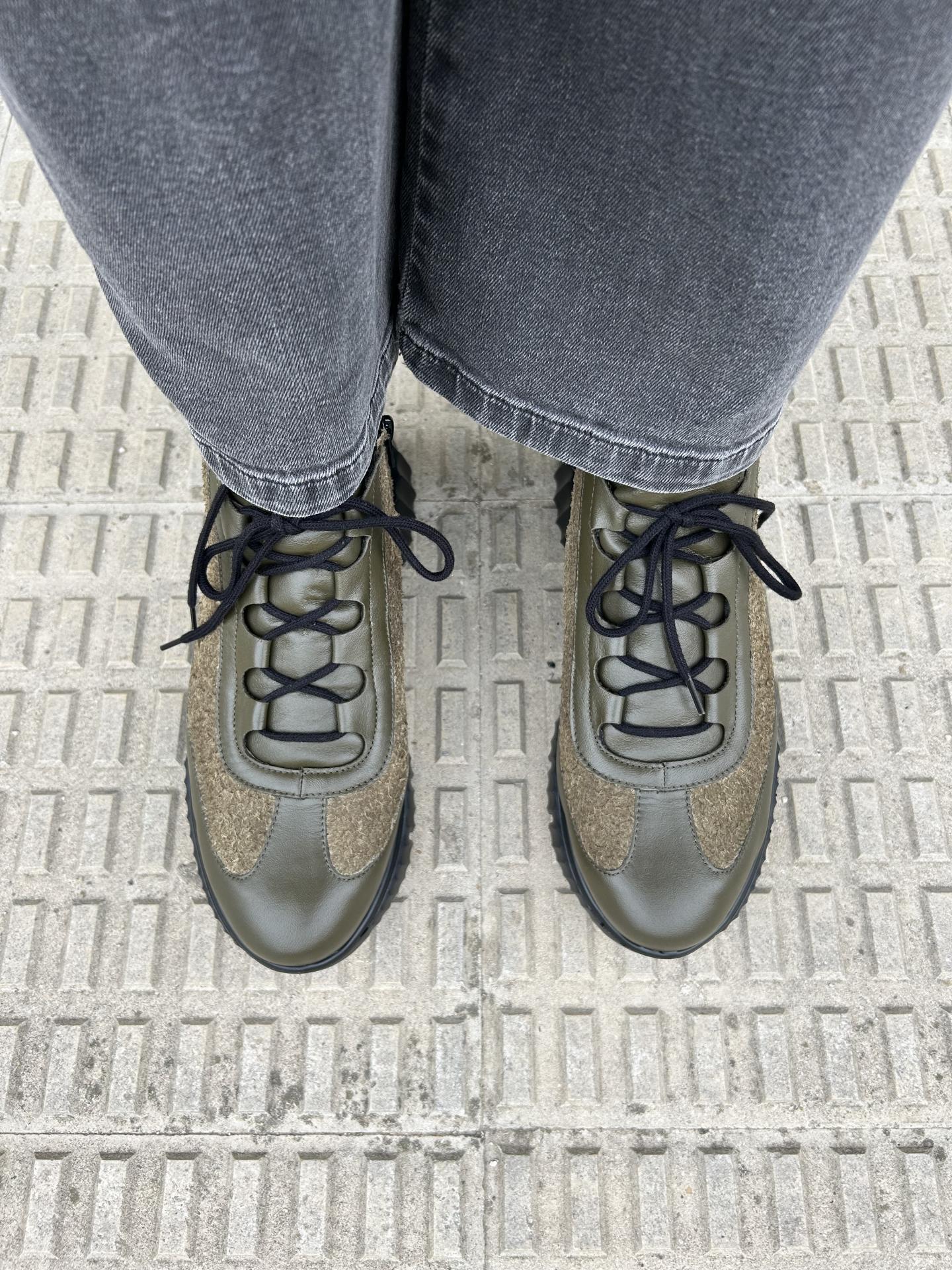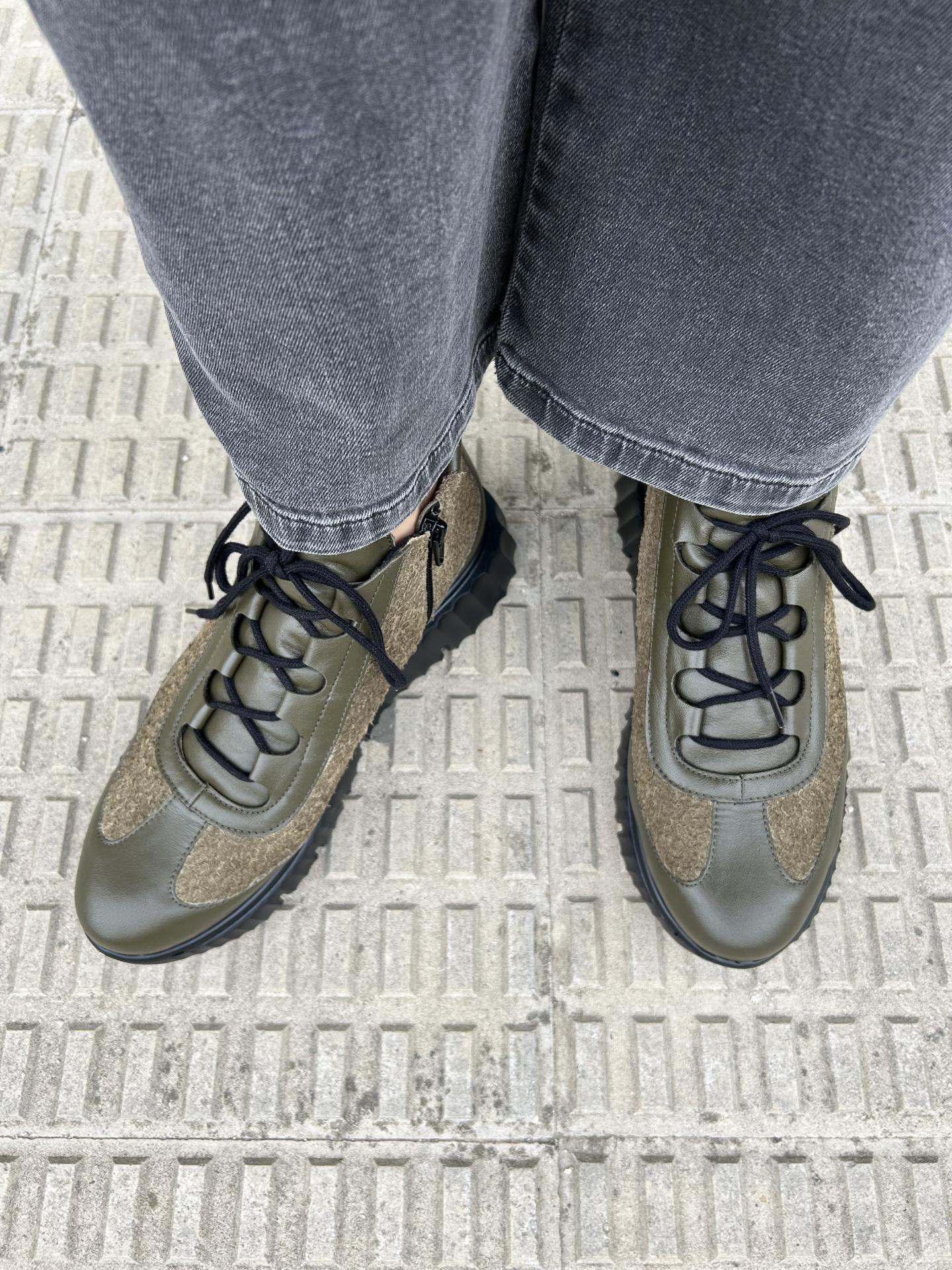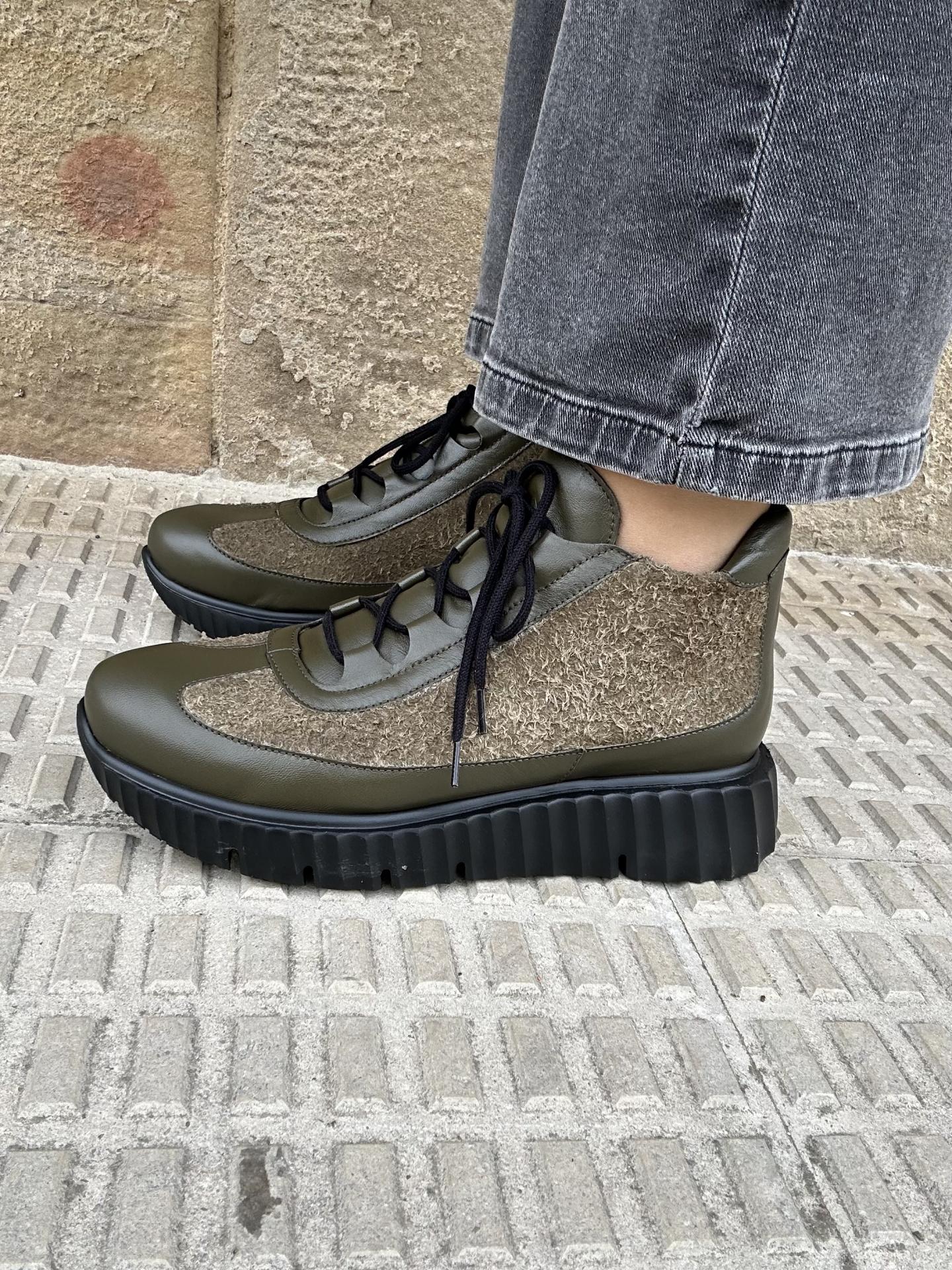 Botín sport estilo deportivo con cordones elaborado en piel y tejido afelpado color verde. Cierre con cremallera en el interior. Plataforma extralight de 4 cm de altura y 2 cm en la parte delantera.