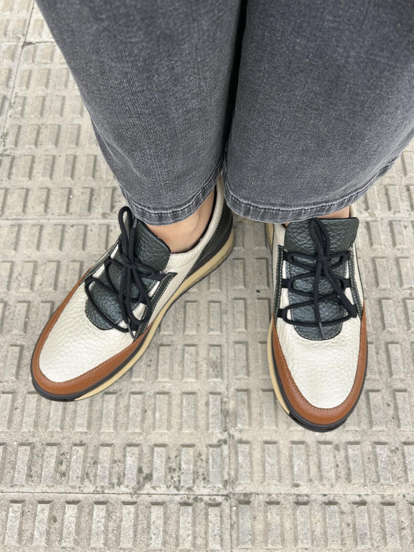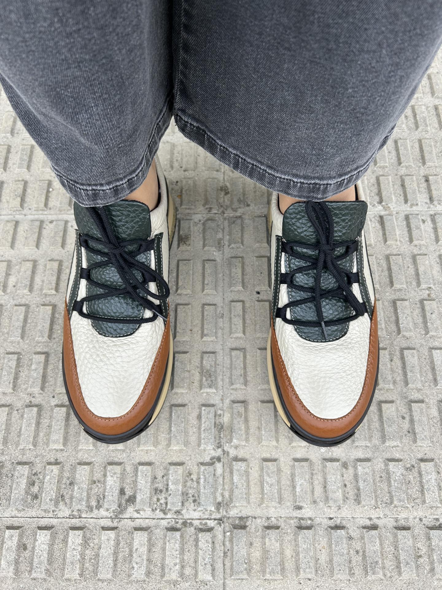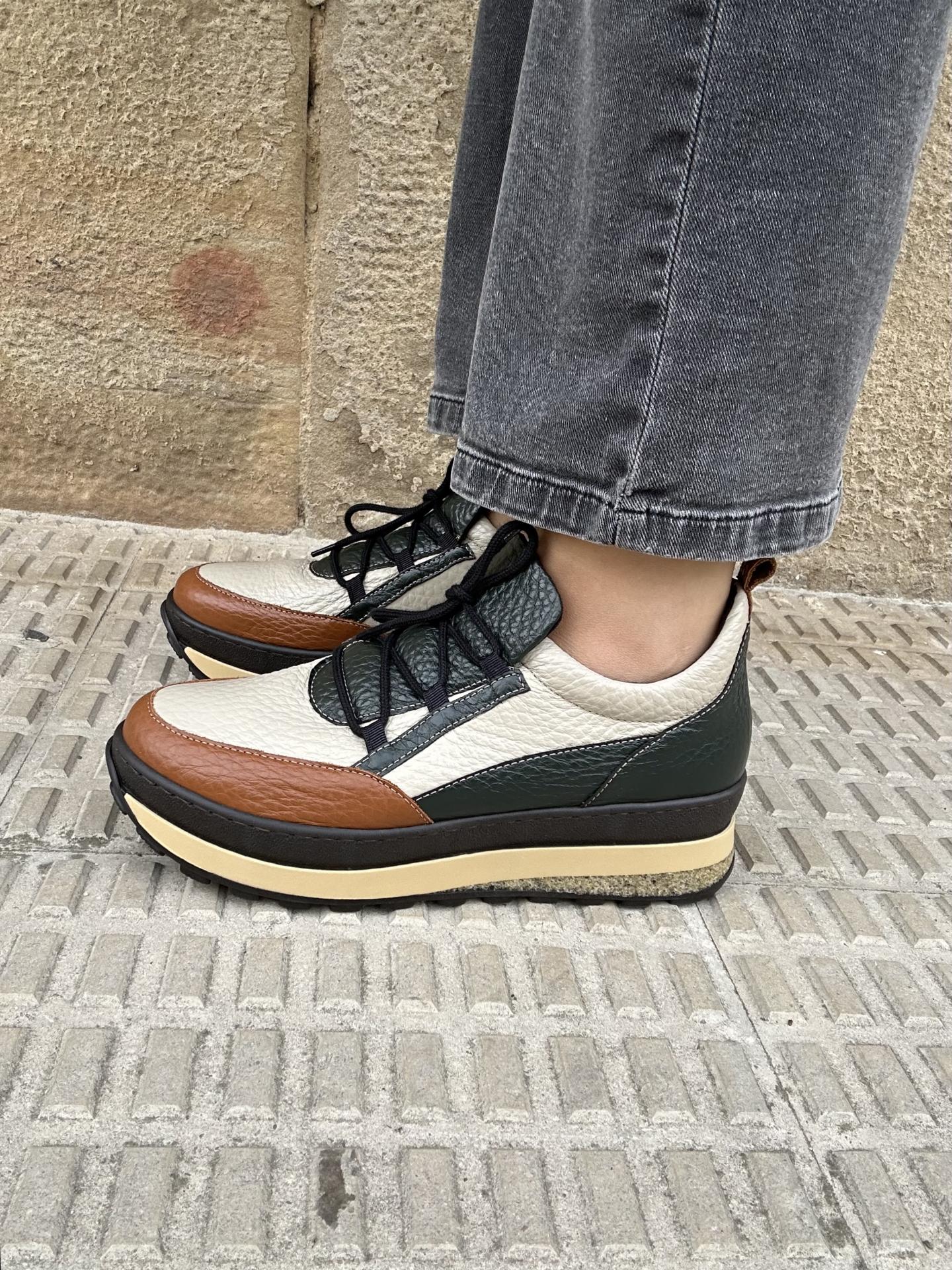 Zapato tricolor elaborado en piel color verde, camel y crema. Cierre con cordones. Plataforma de 5 cm de altura y 3,5 cm en la parte delantera.