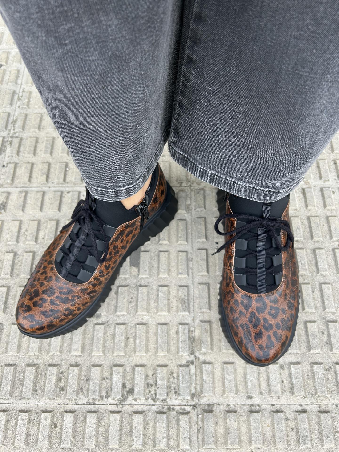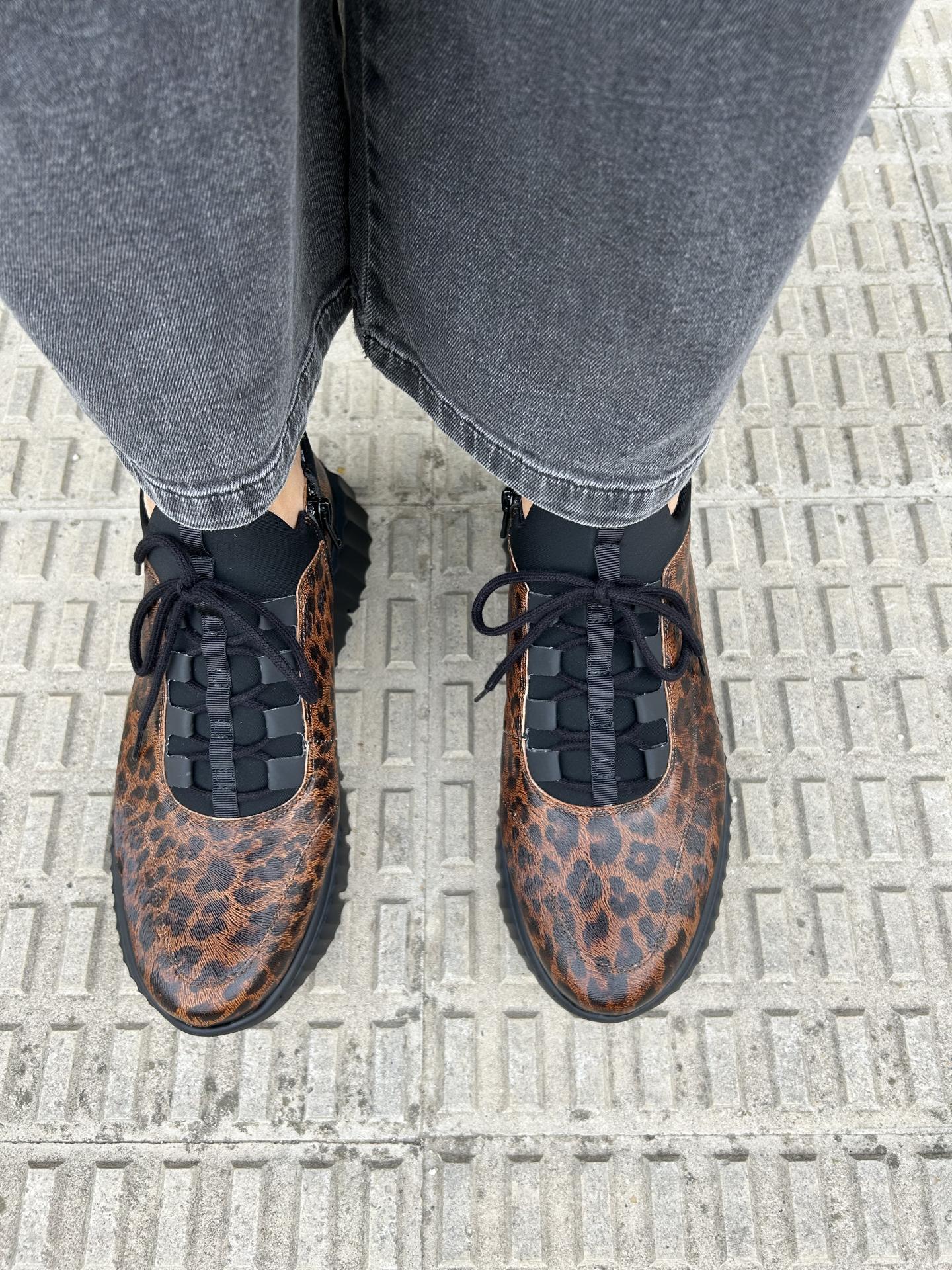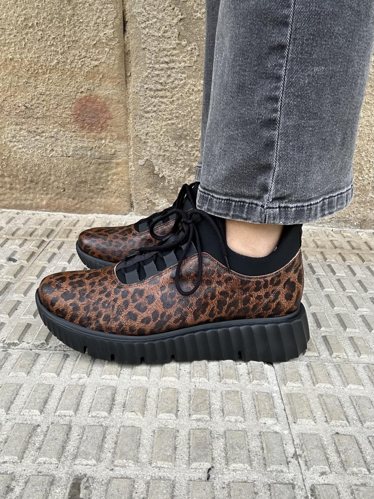 Botín sport estilo deportivo con cordones elaborado en piel con estampado de leopardo. Cierre con cremallera en el interior.
