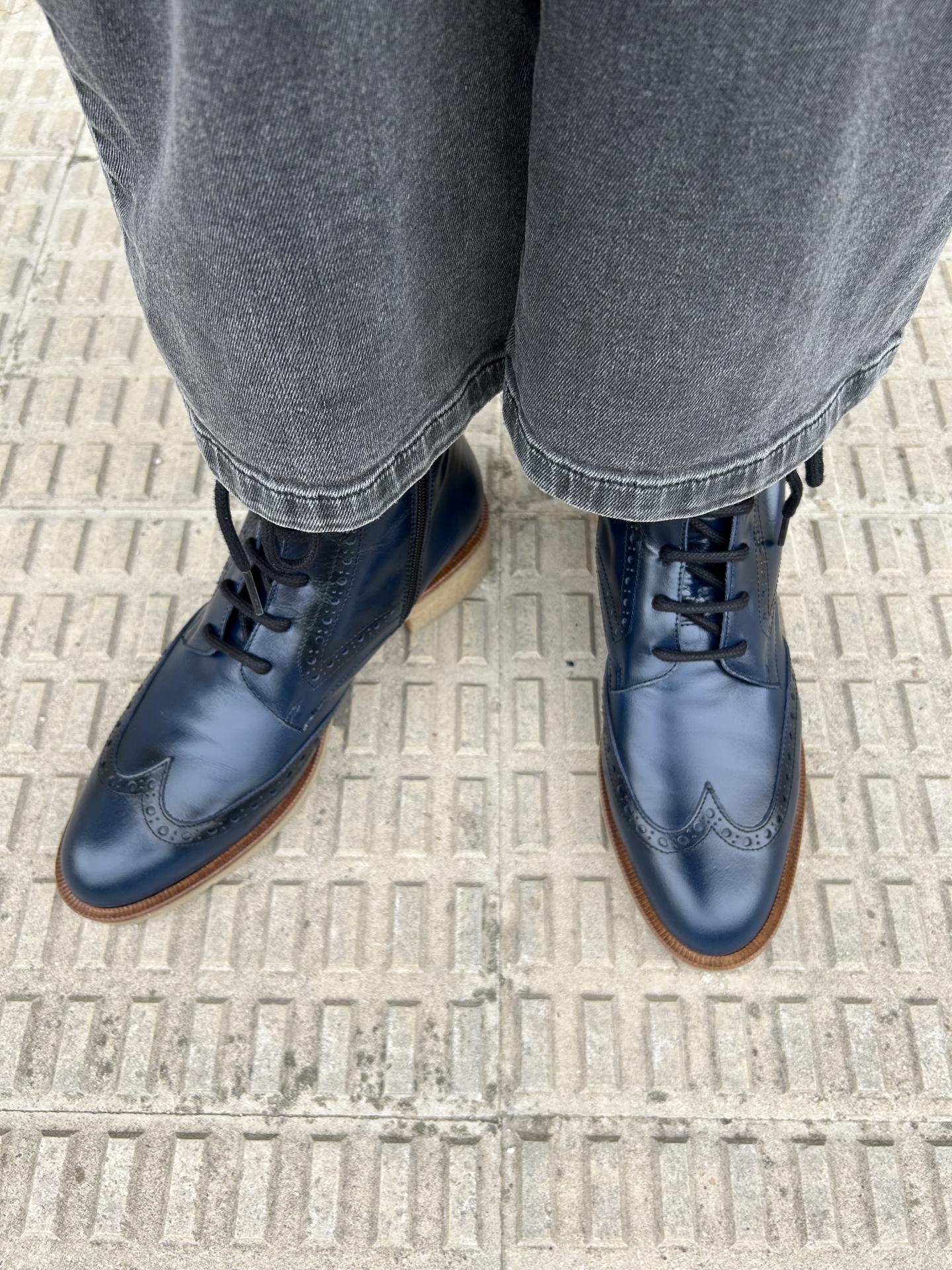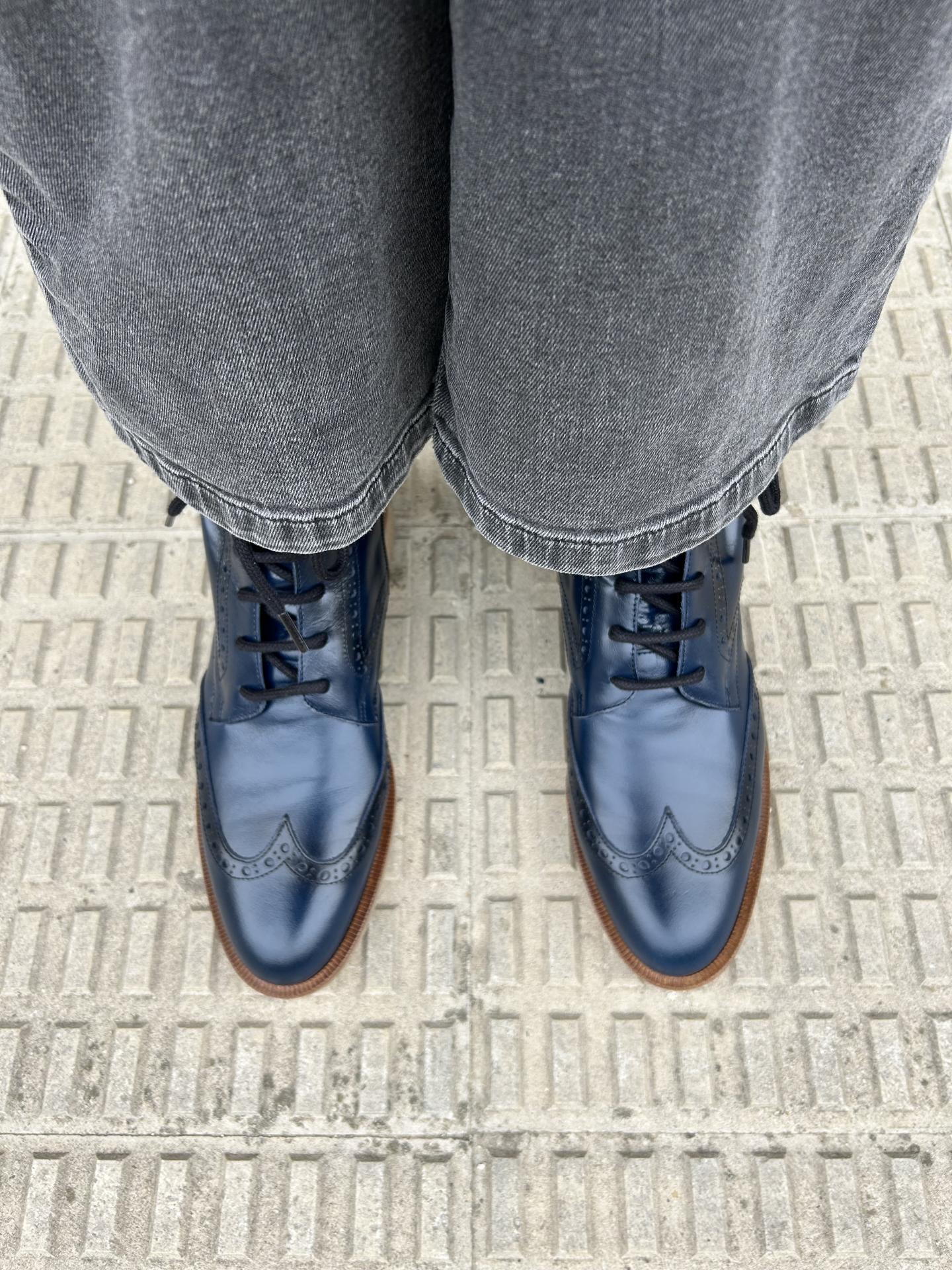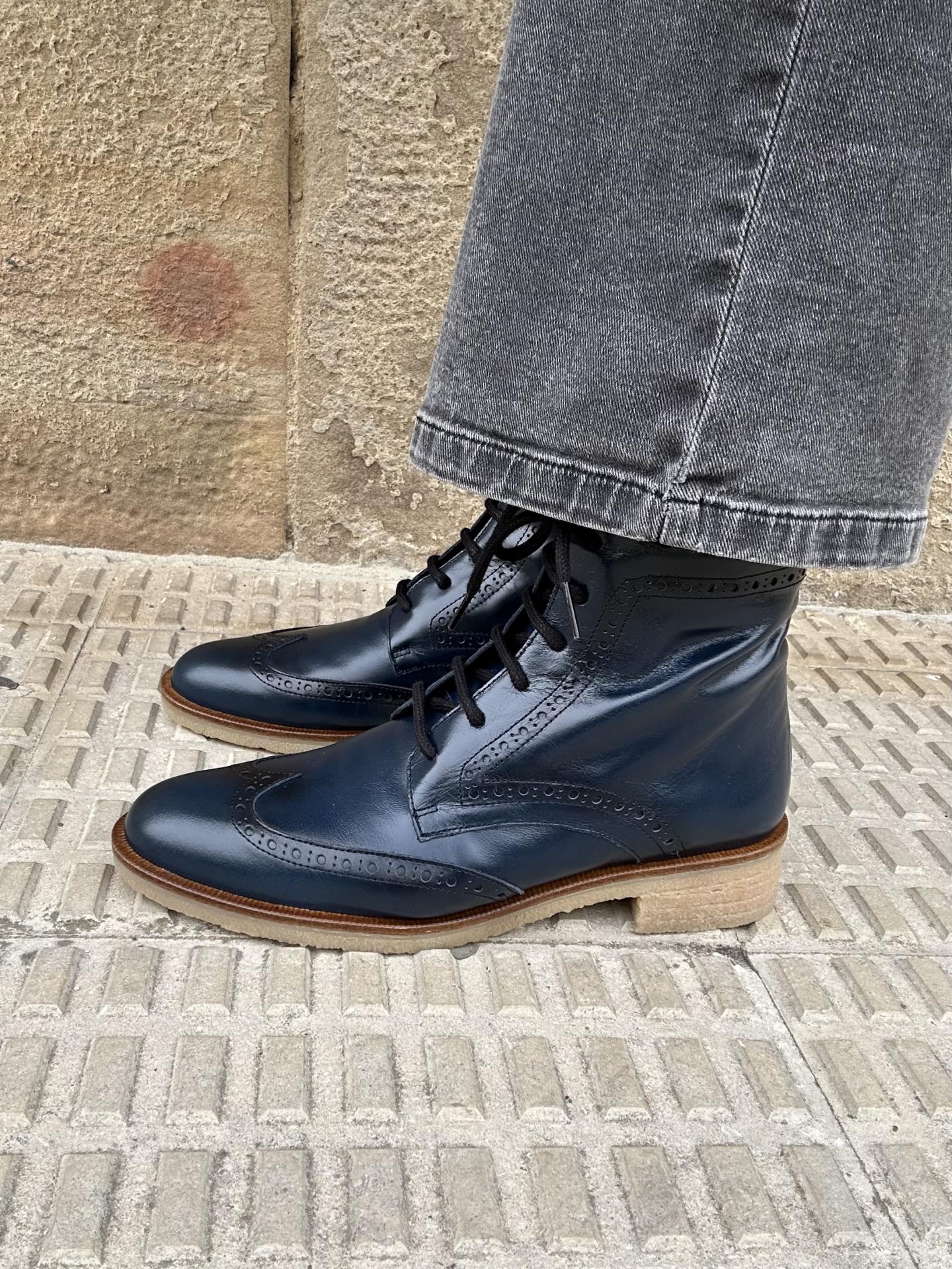 Botín acordonado elaborado en piel color azul marino. Cierre con cremallera en el interior. Suela de goma estilo creepe tocino de 3,5 cm de altura.