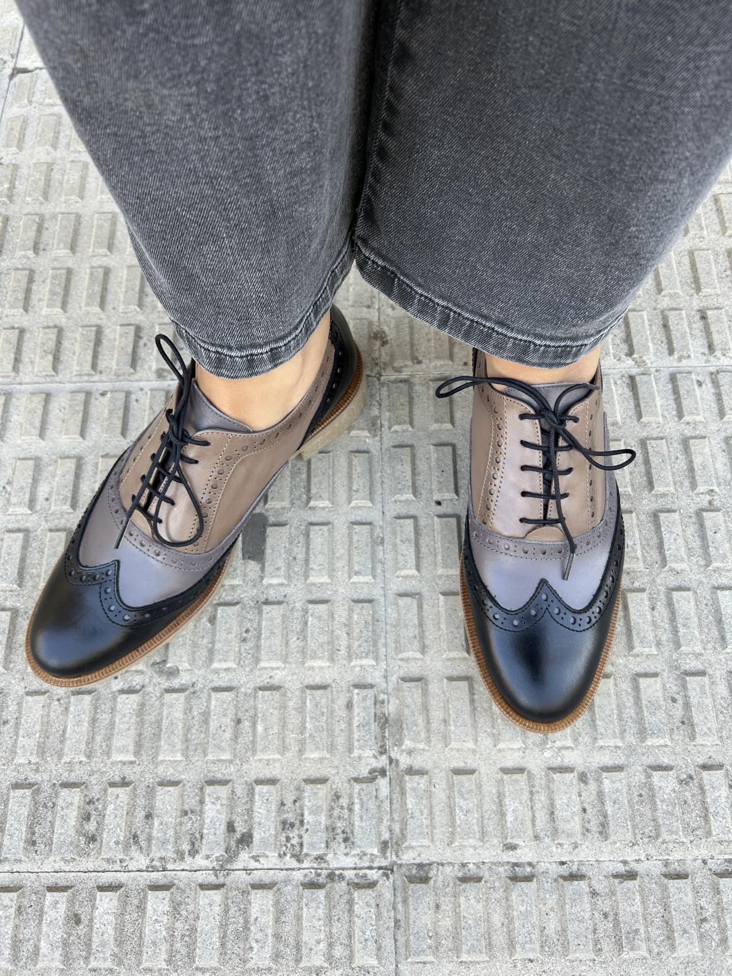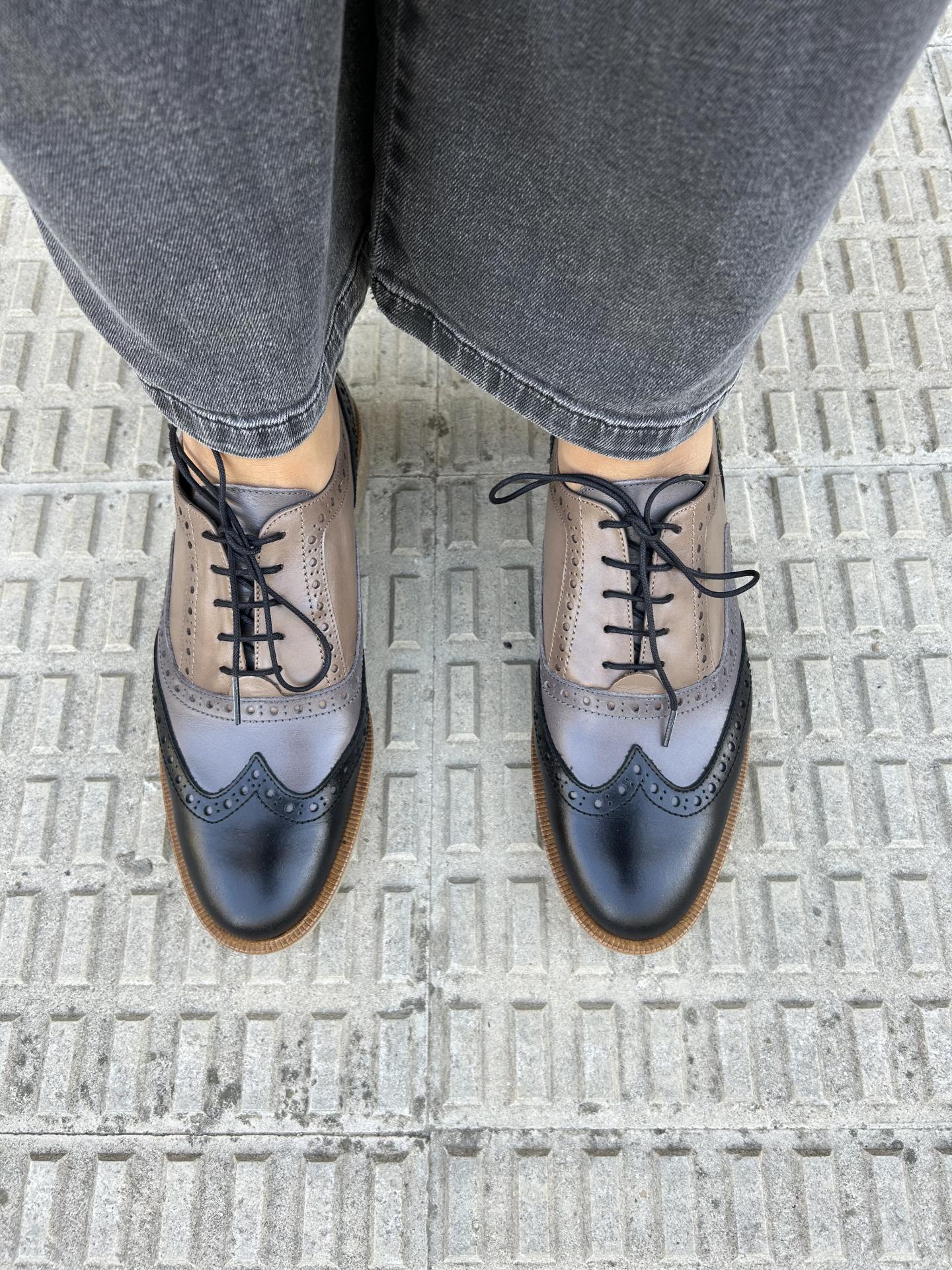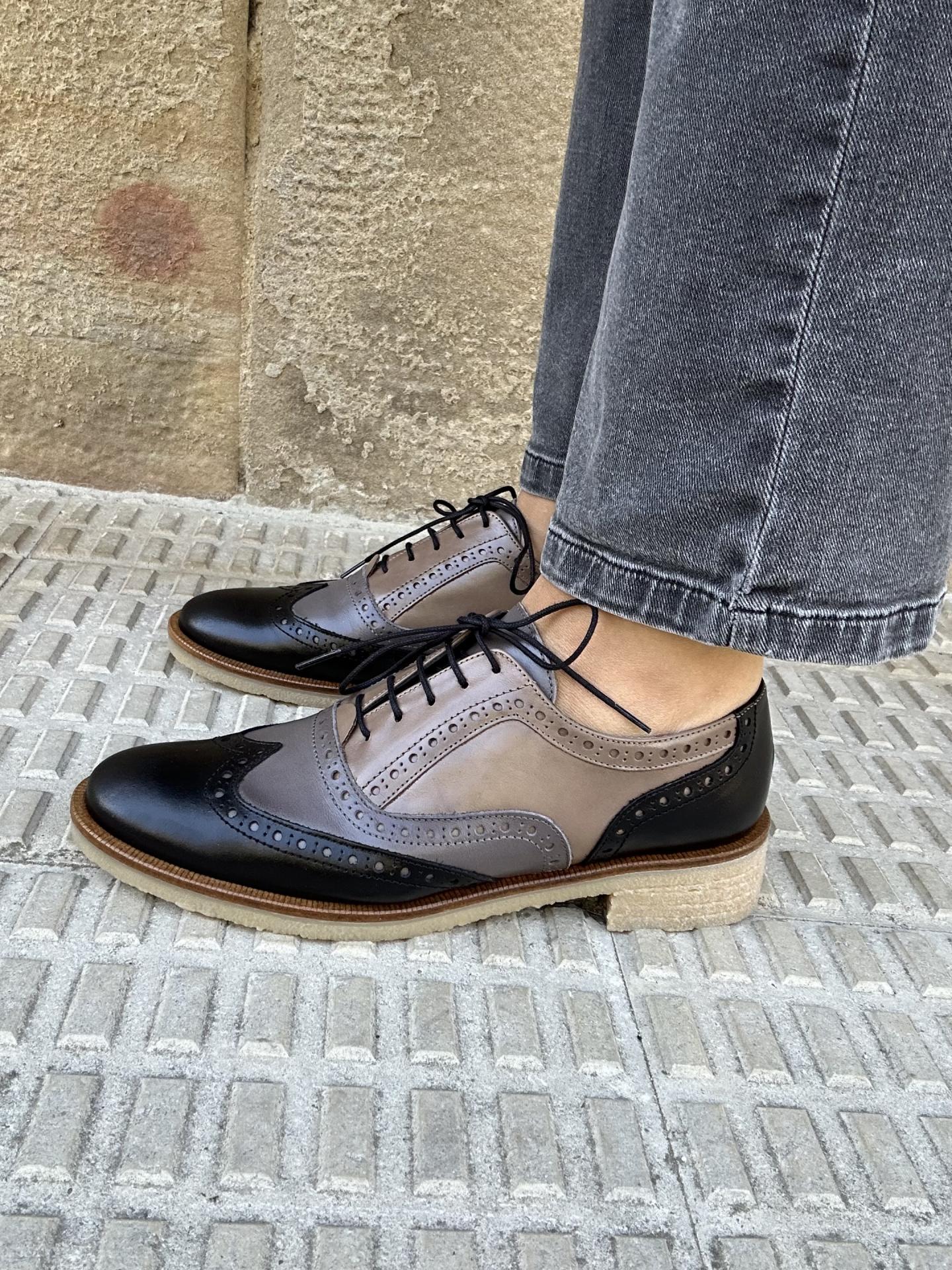Zapato acordonado elaborado en piel color negro, gris y beig. Cierre con cordones. Suela de goma estilo creepe tocino de 3,5 cm de altura.