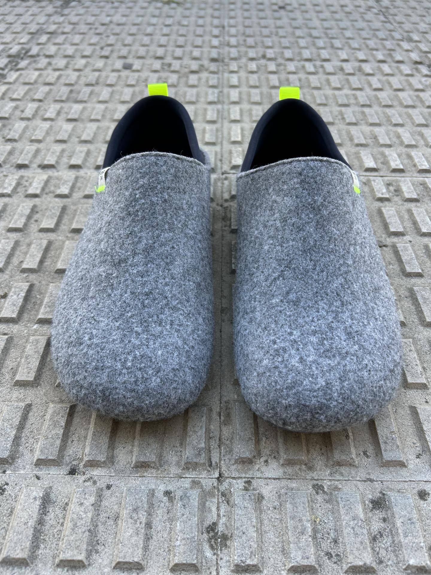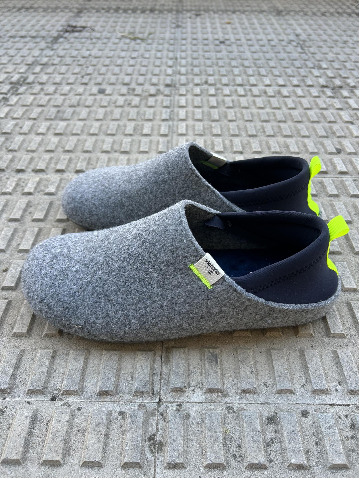 Zapatillas de casa para hombre color gris fabricadas en España en fieltro reciclado. Trasera de neopreno con tirador en contraste, que permite llevarlas calzadas o en modo destalonado.