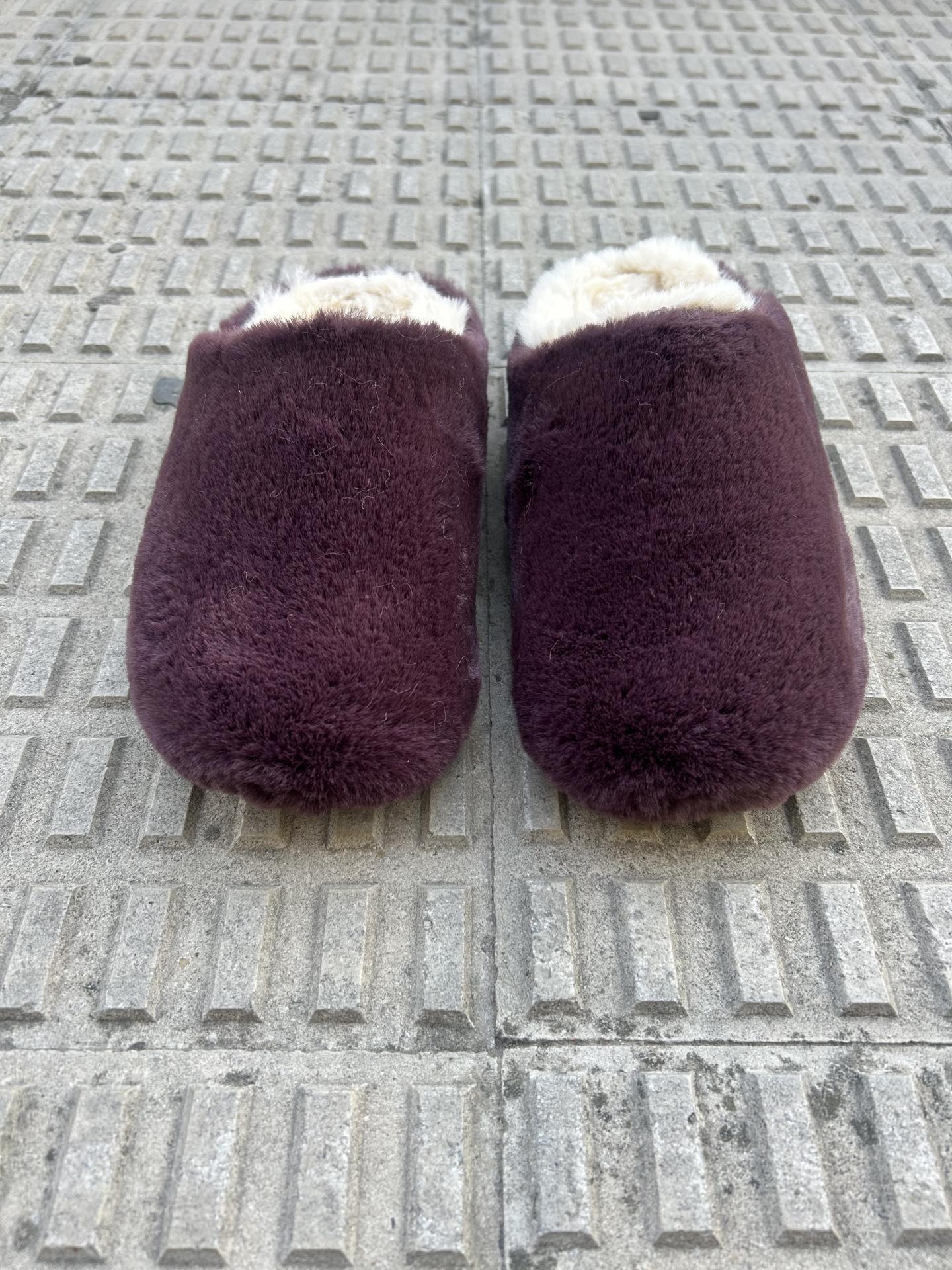 Zapatillas de casa para mujer destalonadas fabricadas en pelo color burdeos y plantilla de pelo suave que aporta confort y calidez.