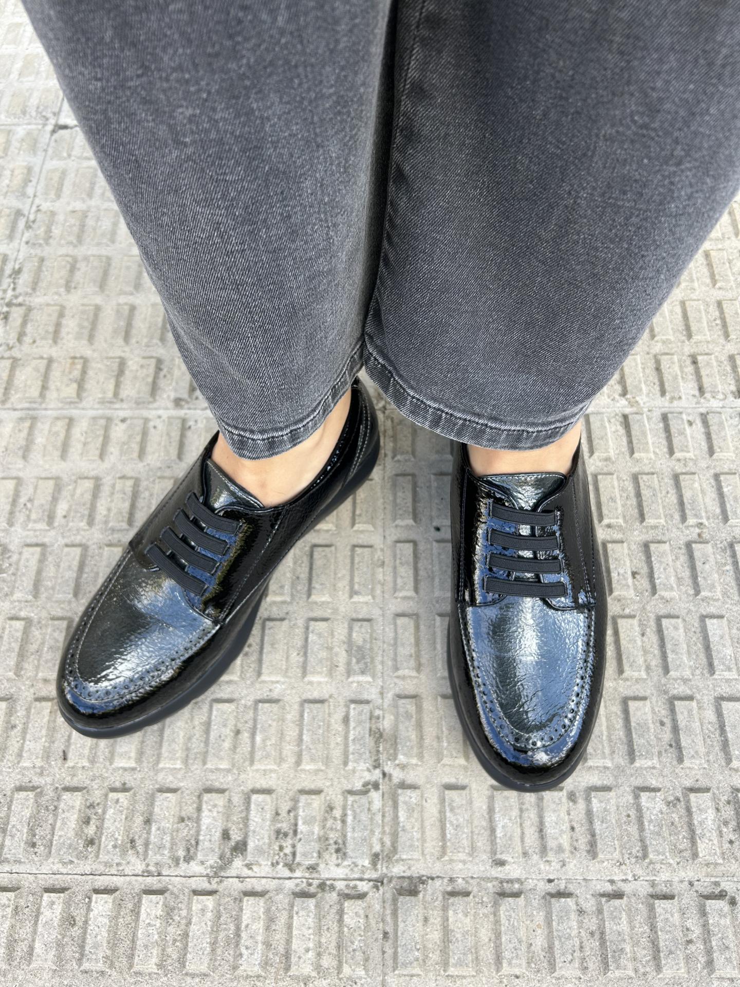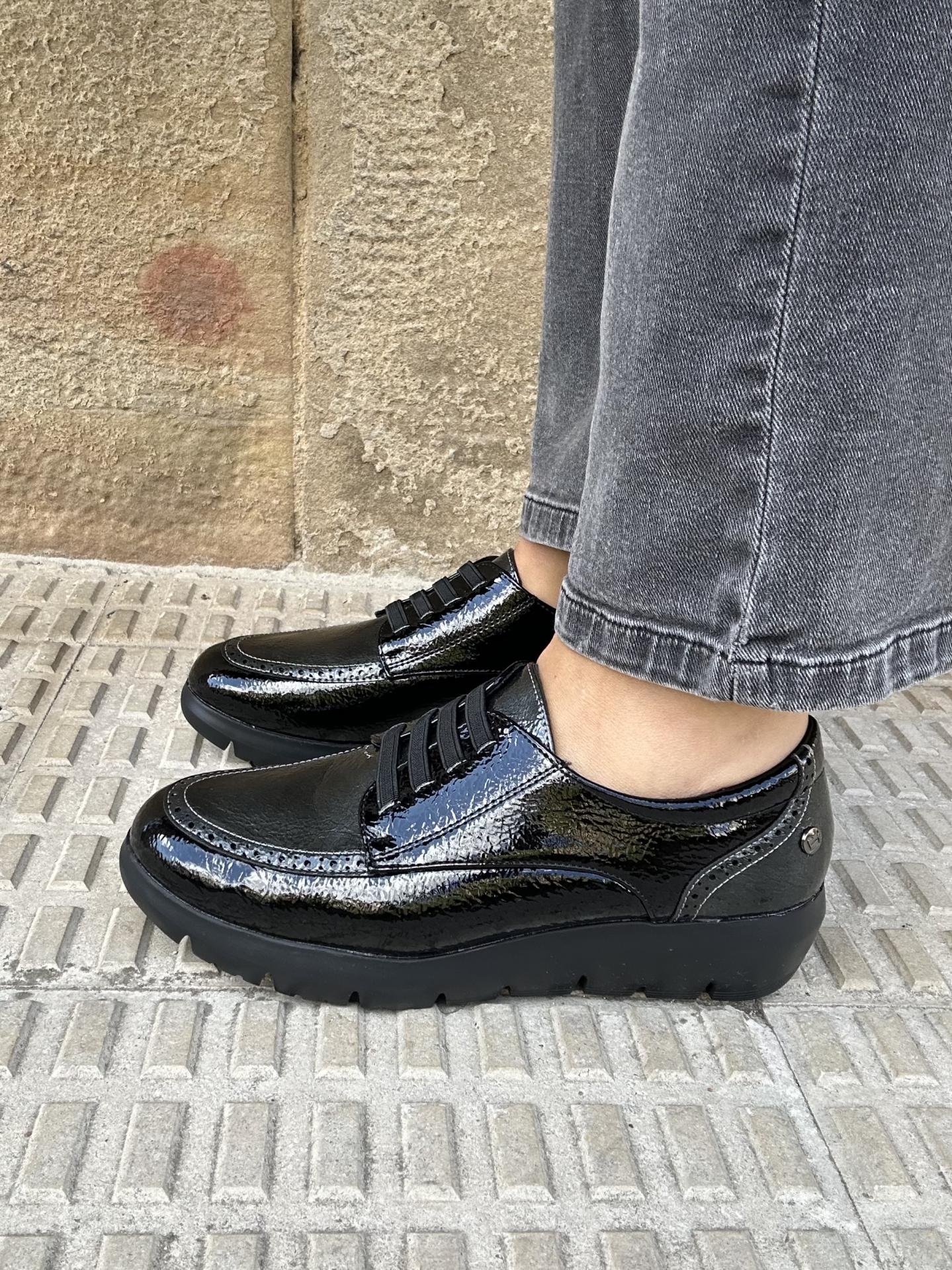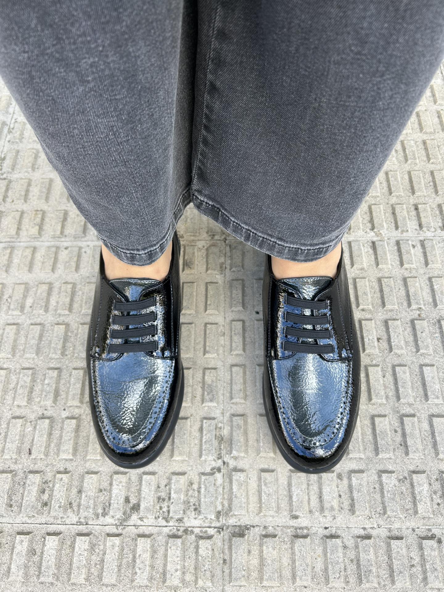 Elaborado en charol color negro con gris combinado con detalle de picaditos y cierre con cordón elástico.