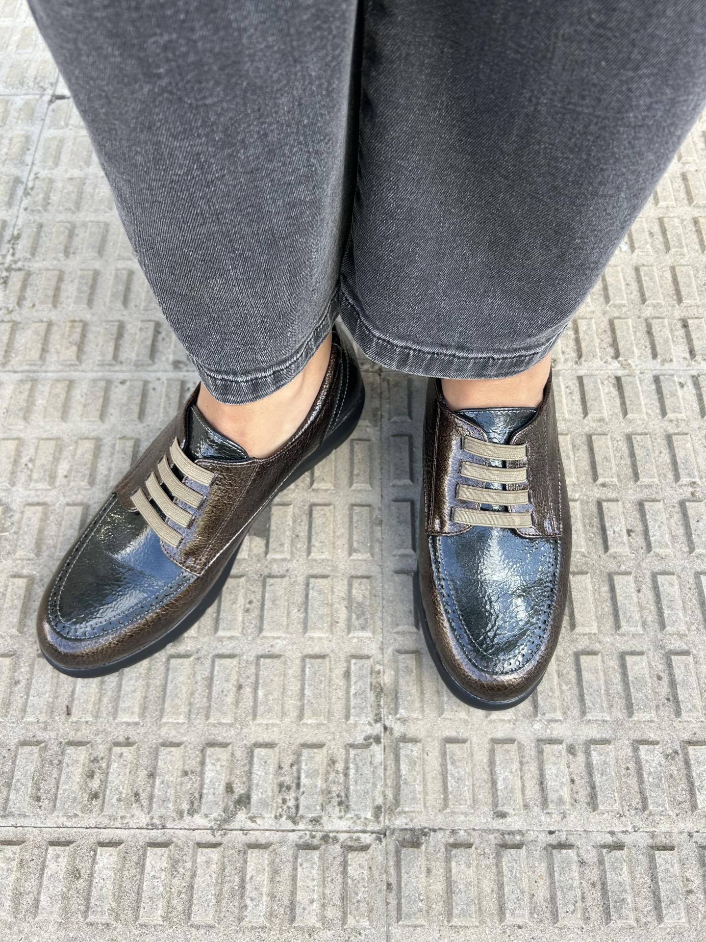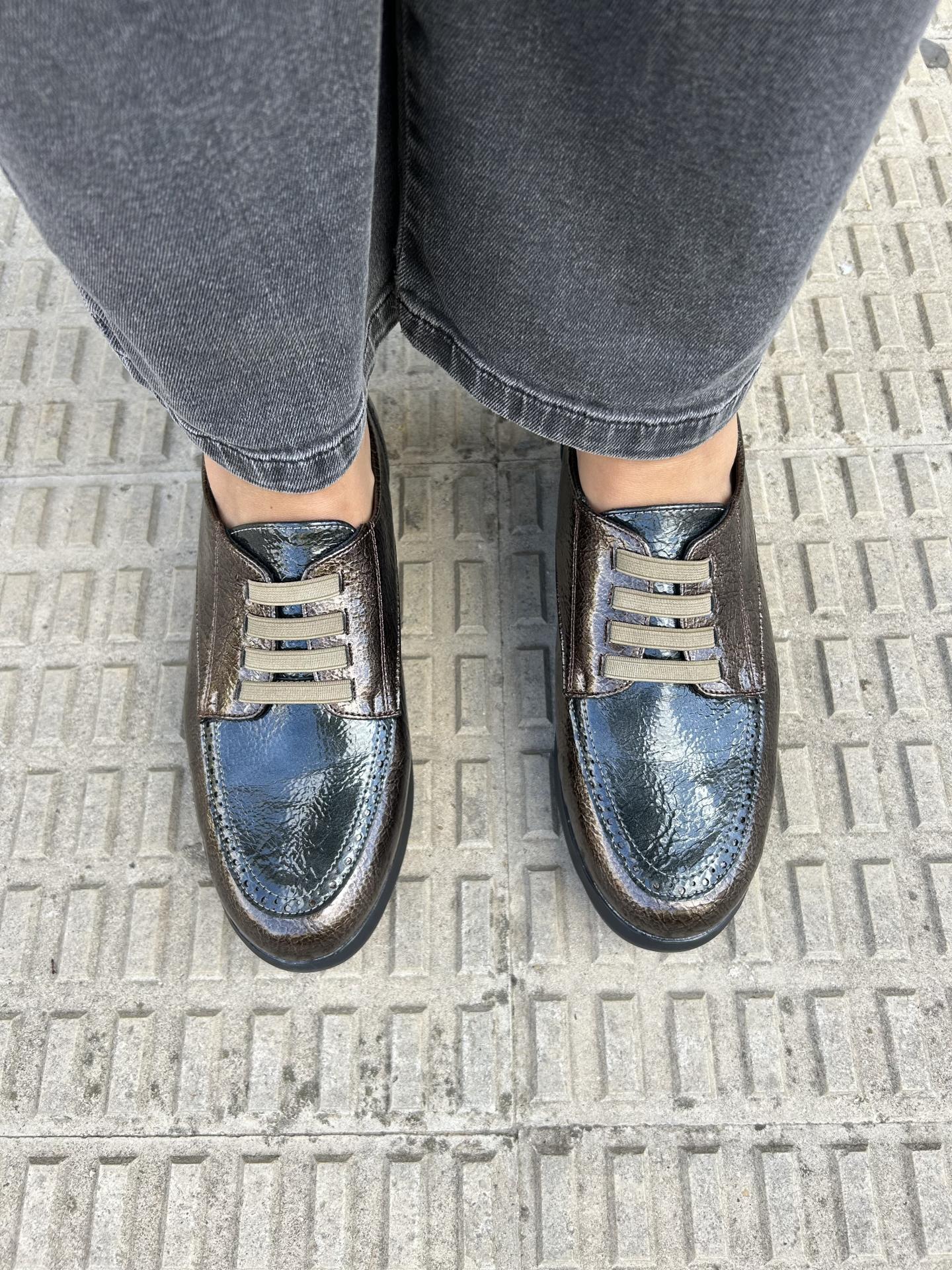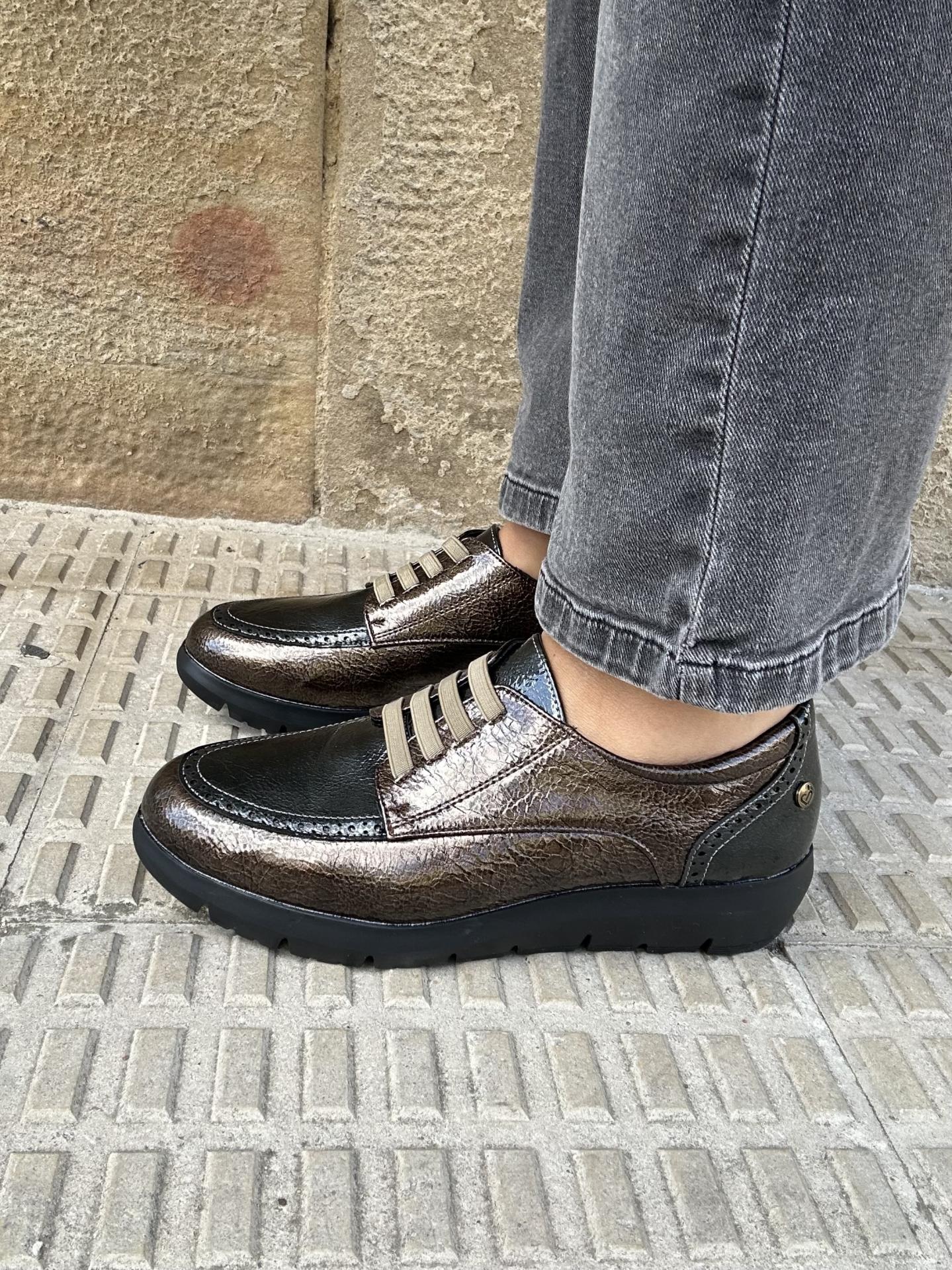 Elaborado en charol color taupe con gris combinado con detalle de picaditos y cierre con cordón elástico.