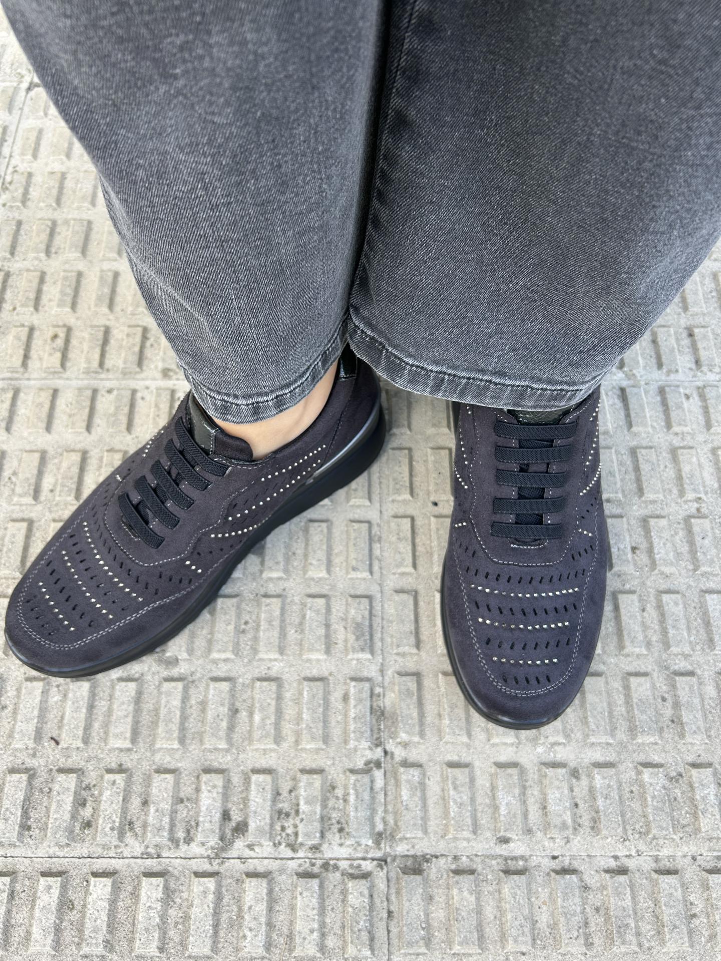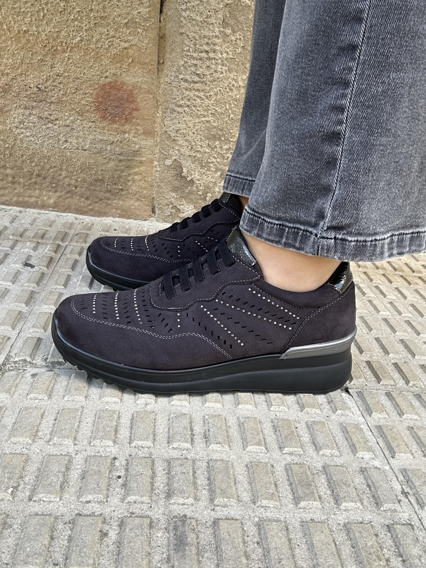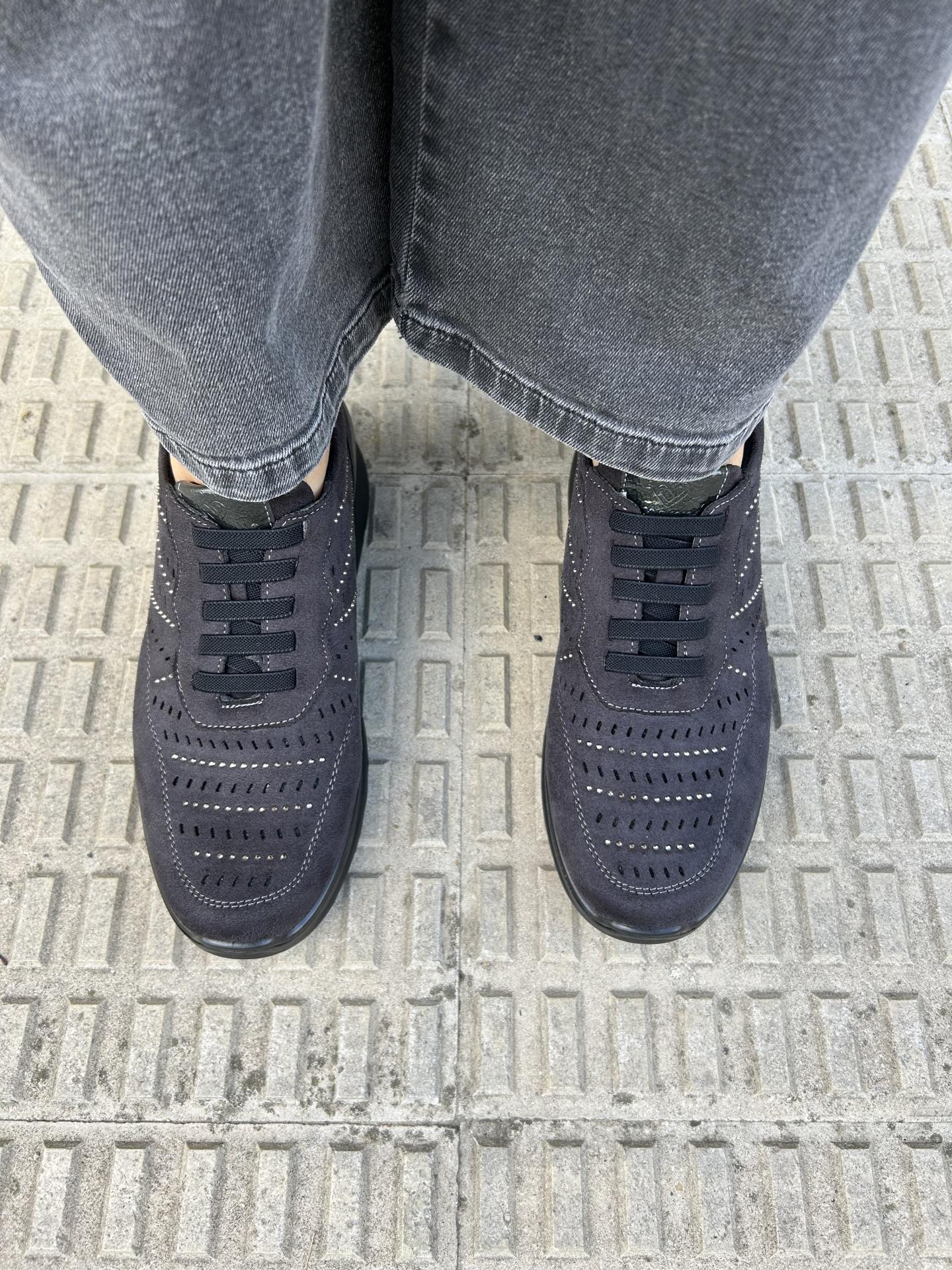 Elaborado en nubuc color gris con detalle de brillantes y picaditos y cierre con cordón elástico.