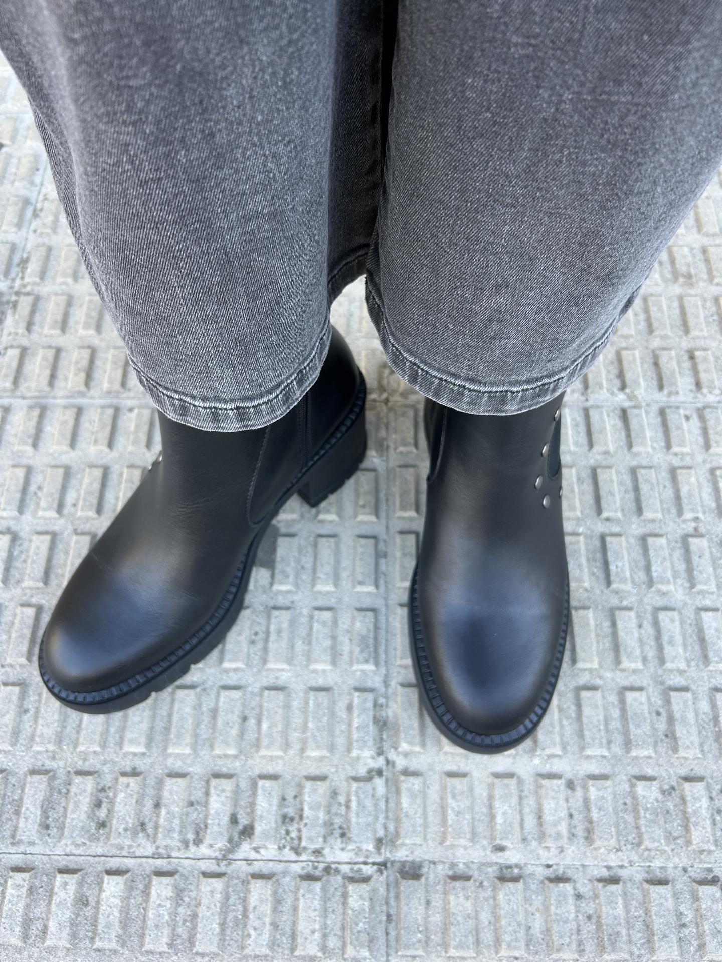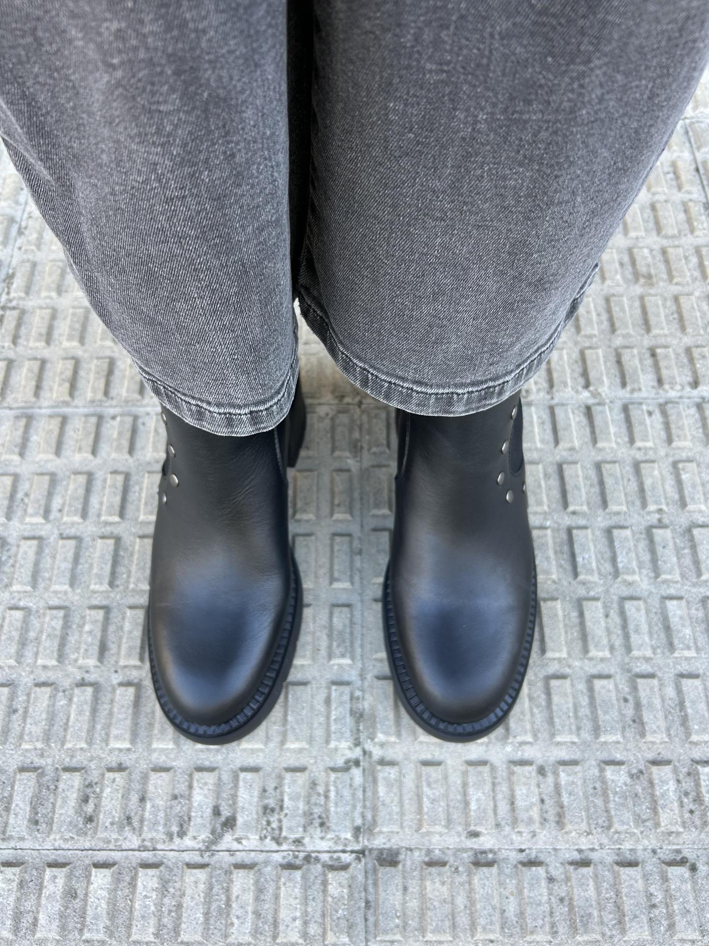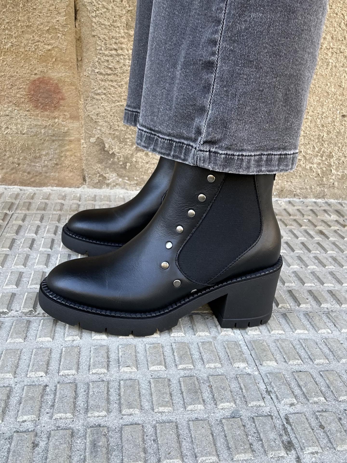 Botín con tacón elaborado en piel color negro. Cierre con cremallera en el interior. Adorno de tachuelas y elástico.