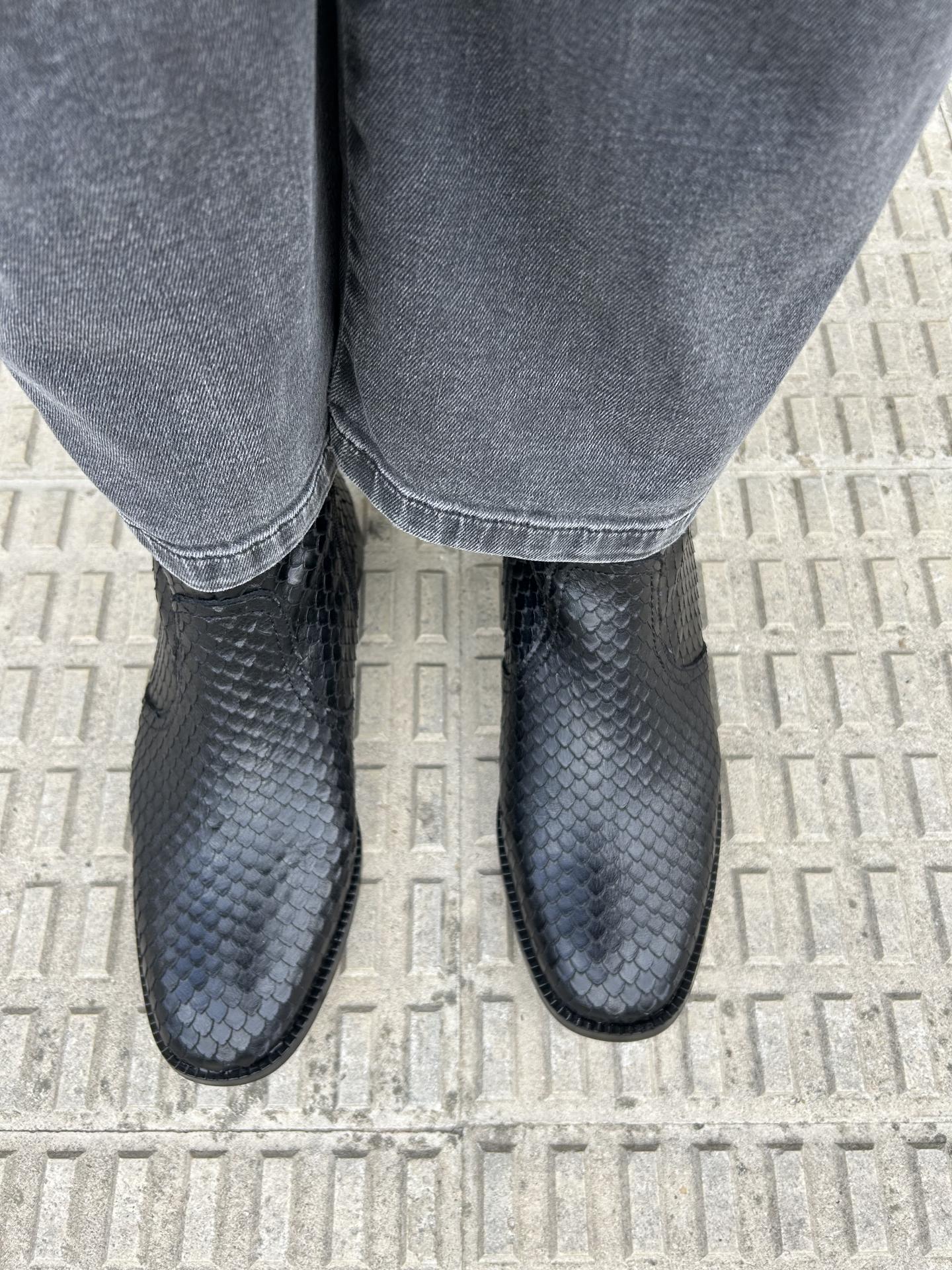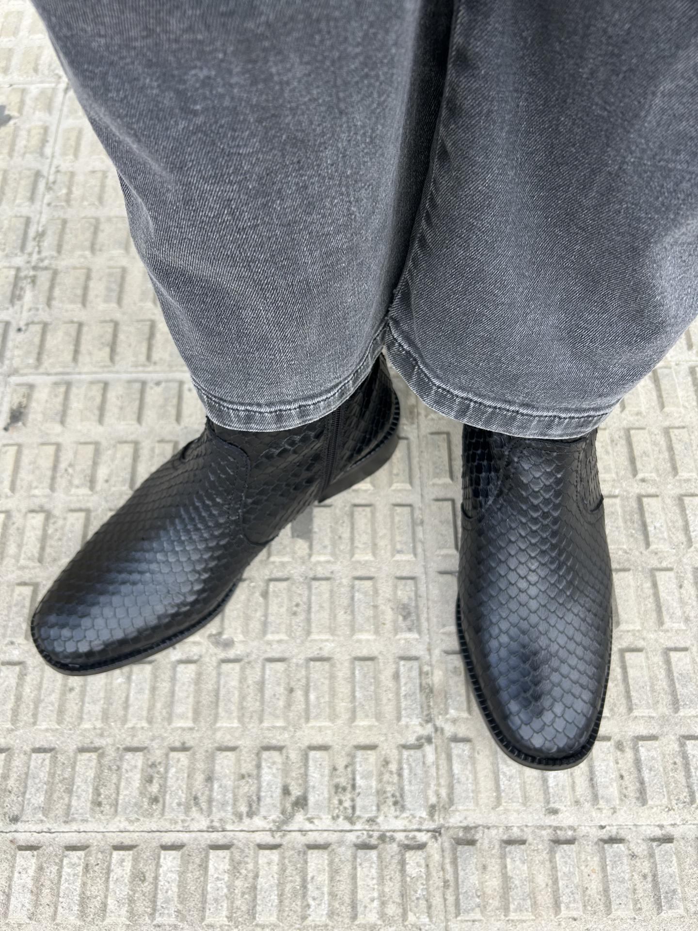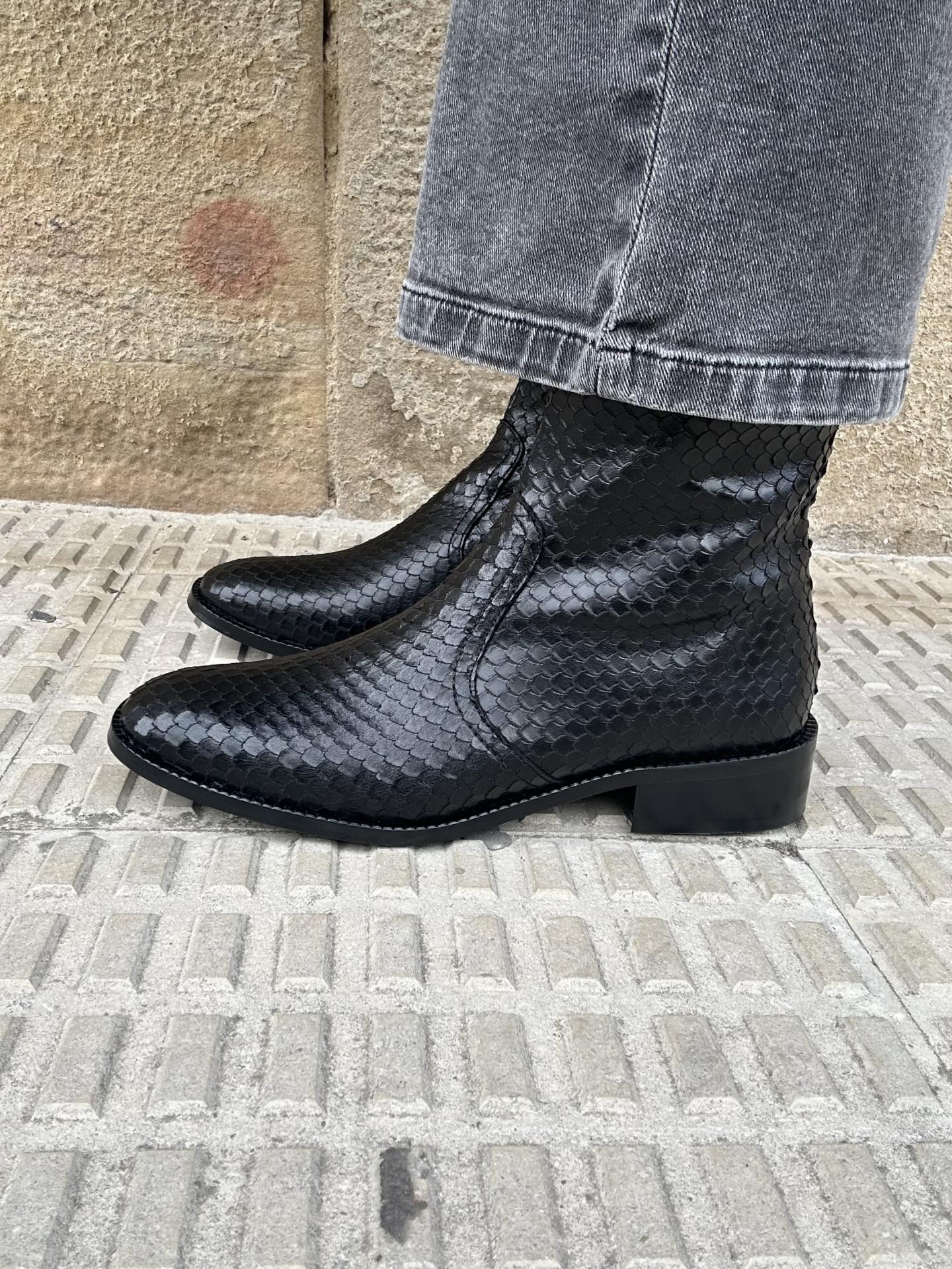 Botín plano elaborado en piel labrada con escamas color negro. Cierre con cremallera en el interior.