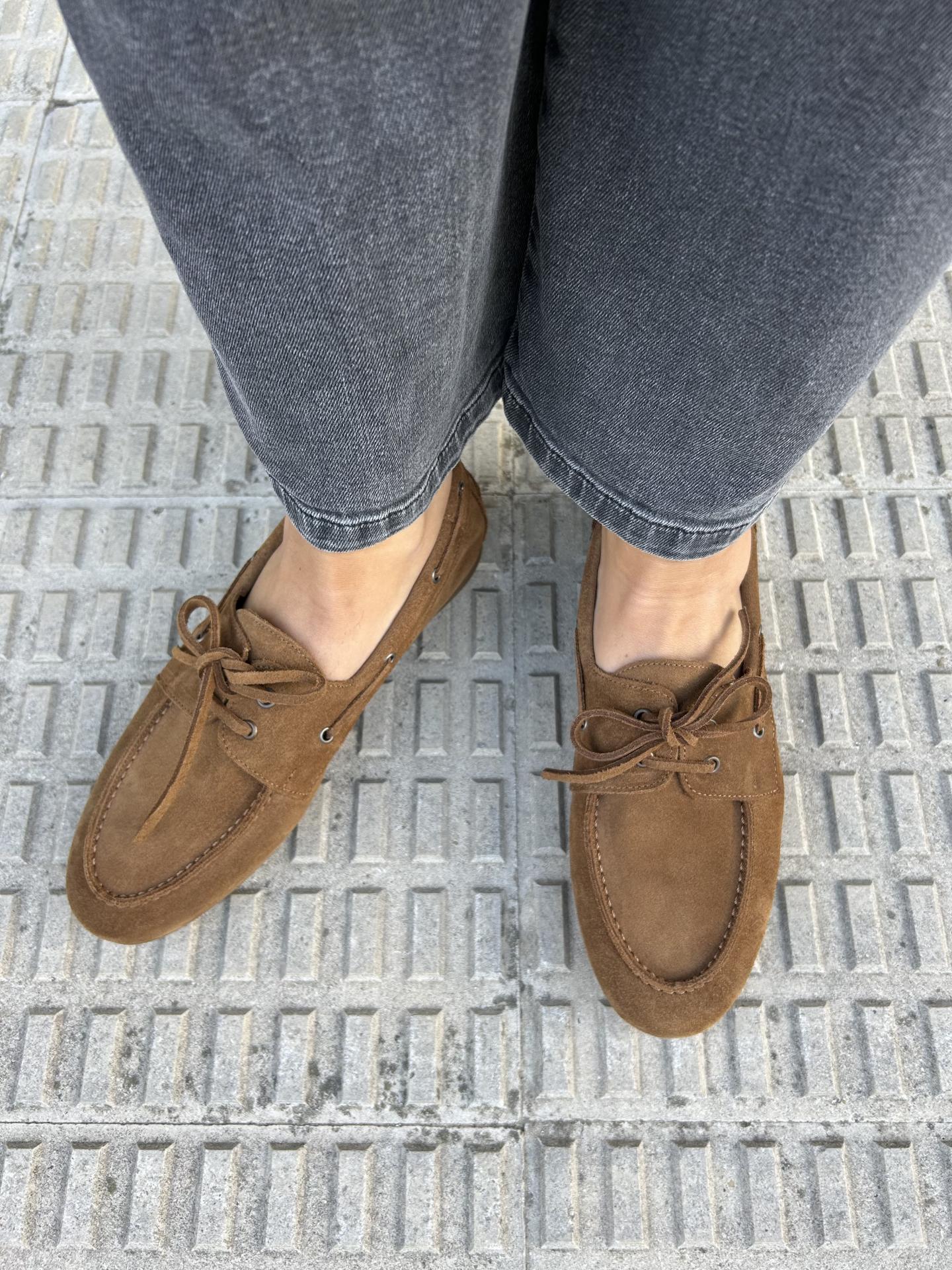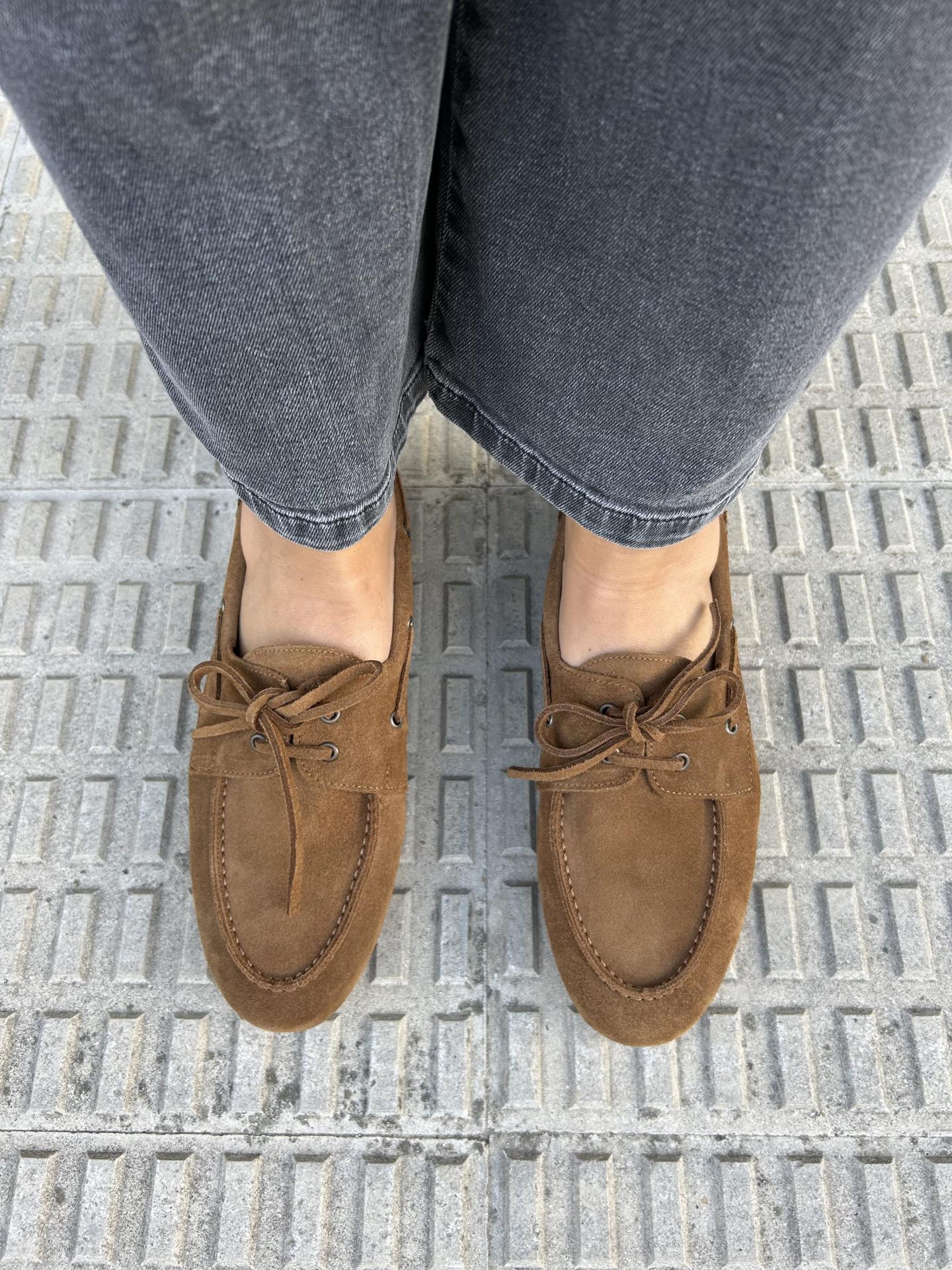Mocasin de estilo nautico elaborado en serraje color camel. Suela flexible de goma y cuña en el talón para mayor comodidad. Cuentan con cordonera extra gratis.