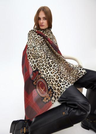 Foular elegante que mezcla estampado animal con diseño tartán en tonos cálidos. Hecho de material suave y ligero, con detalles llamativos de emblema. Perfecto para añadir un toque de estilo a cualquier conjunto.