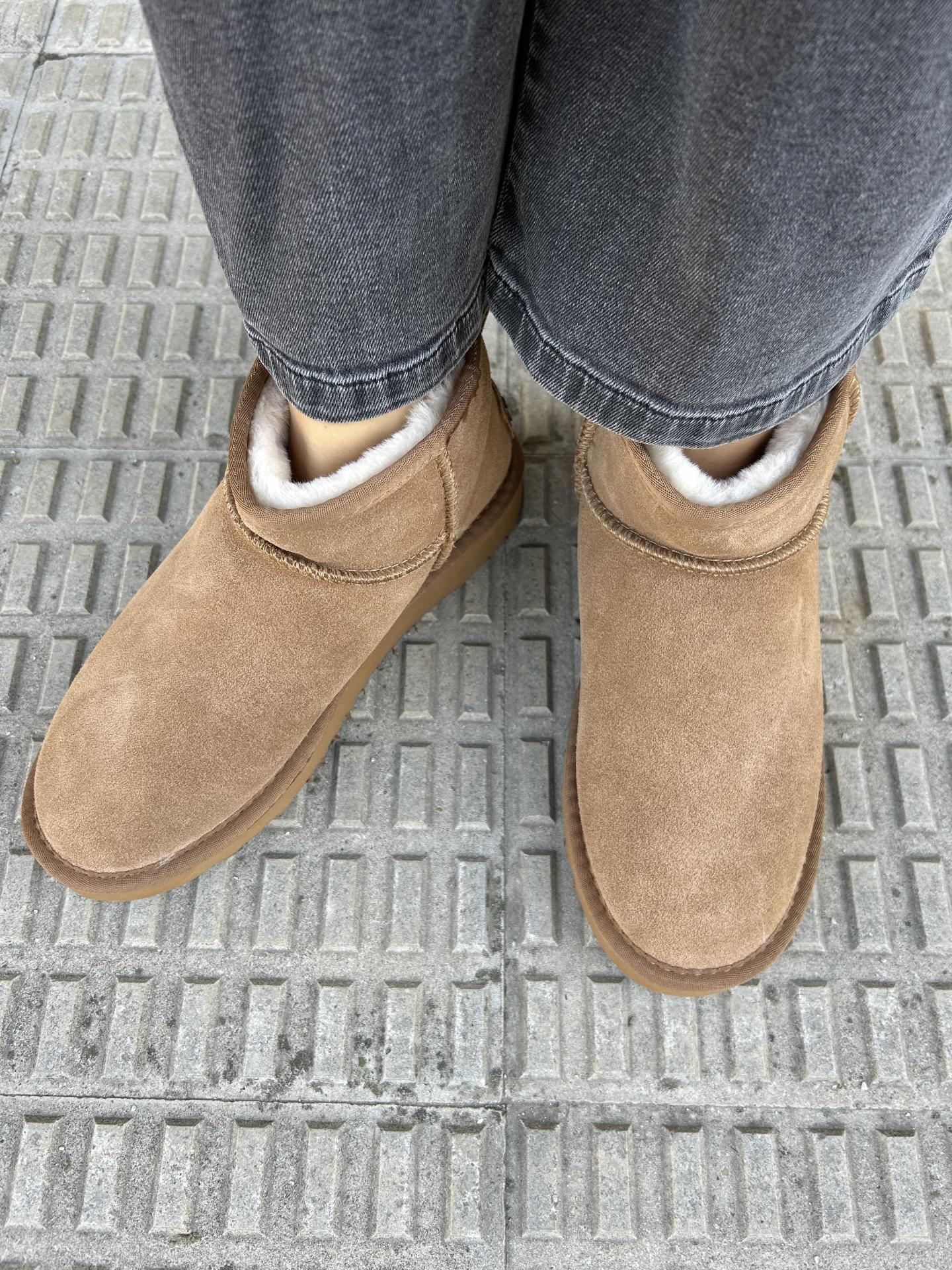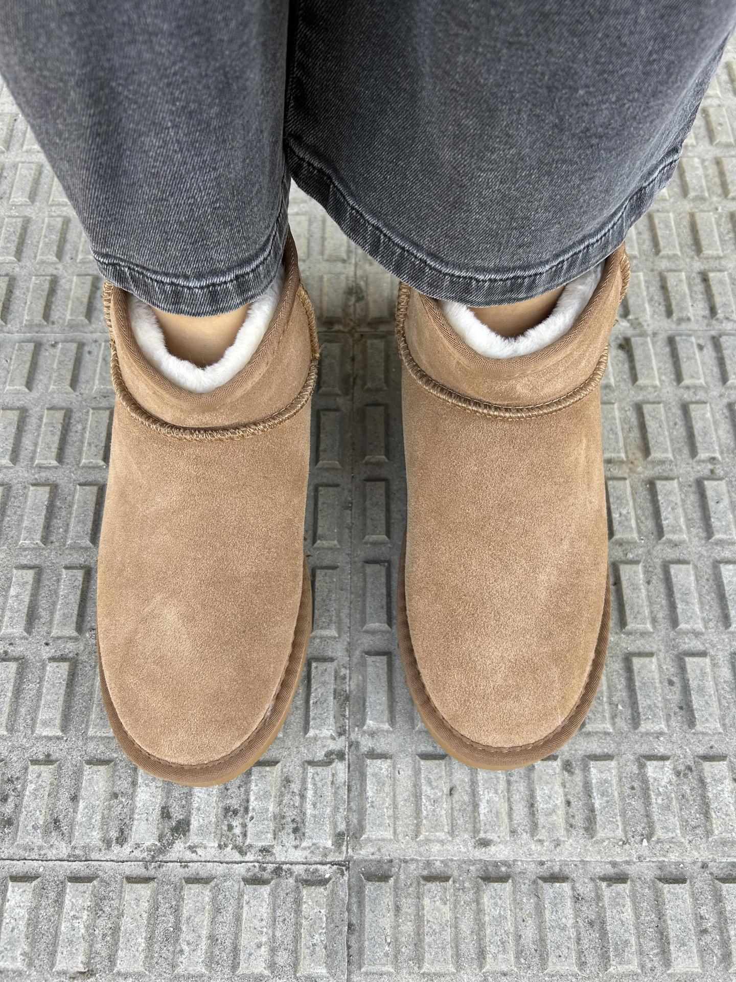 Botin con el interior forrado de pelo elaborado en serraje color camel.
