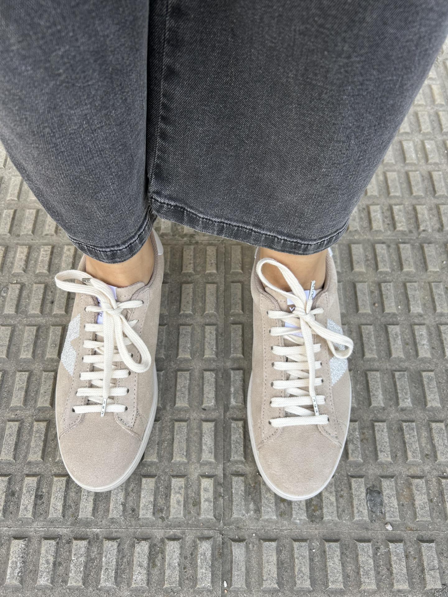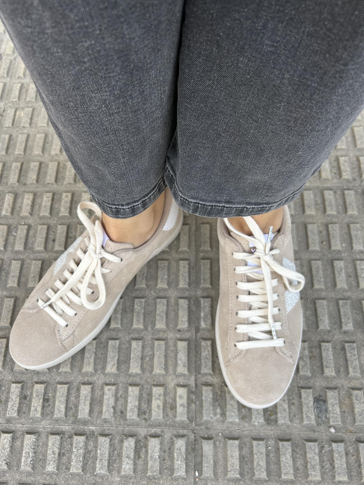 Zapatillas para mujer fabricadas en España en serraje color beige y glitter plata en contraste.