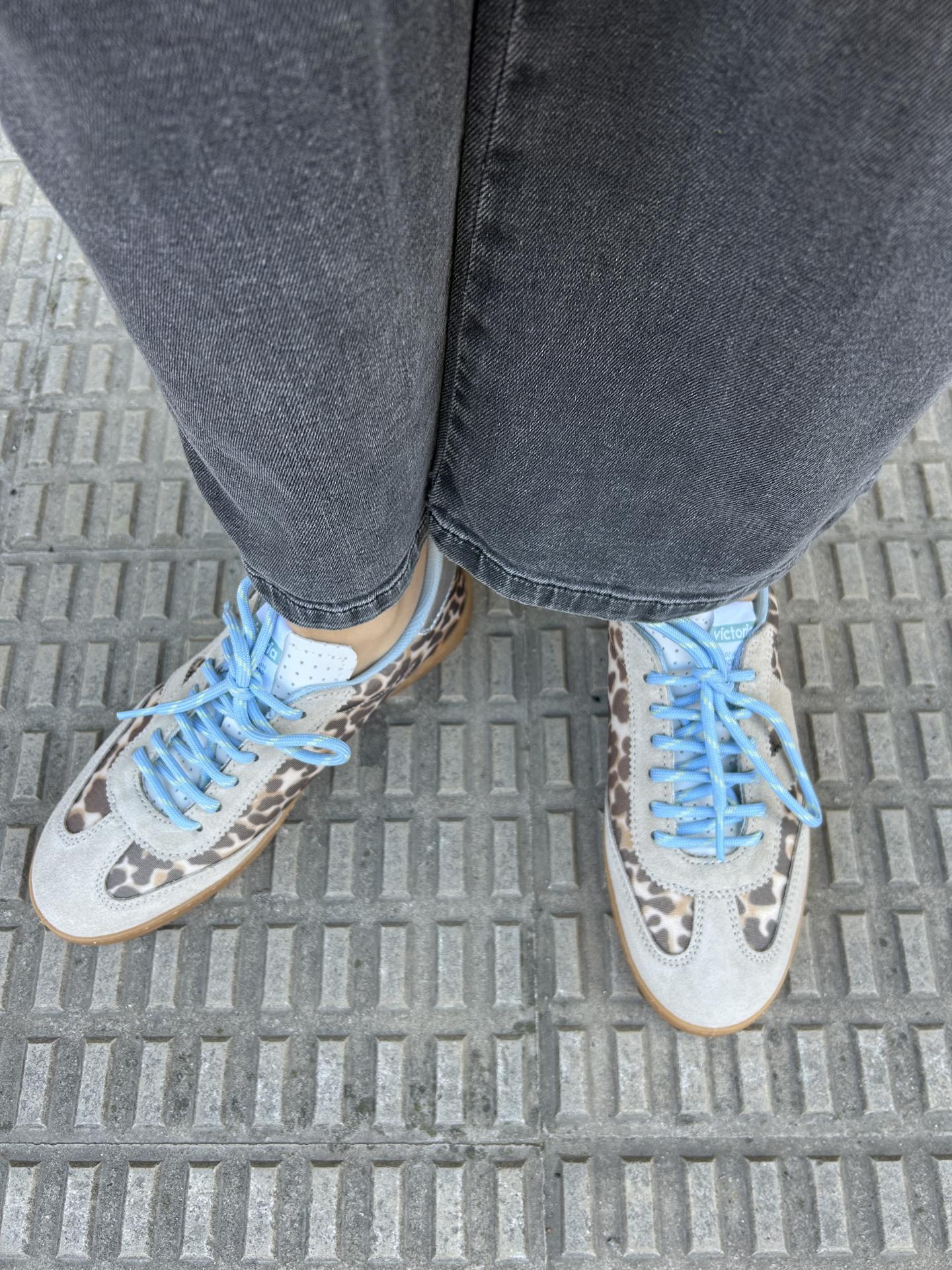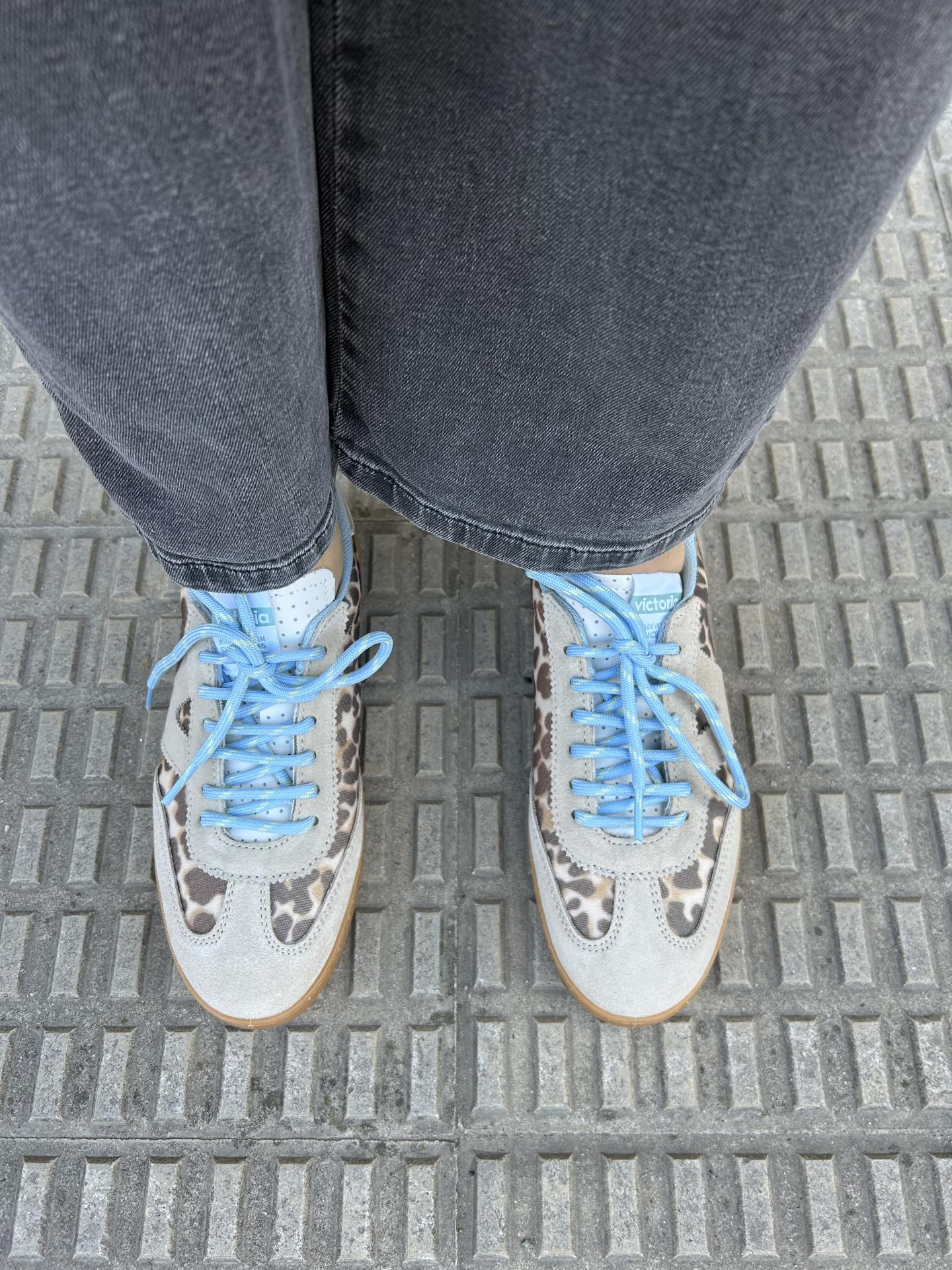 Cierre mediante cordones de tipo redondo en azul, a juego con el forro interior, y lengüeta perforada.