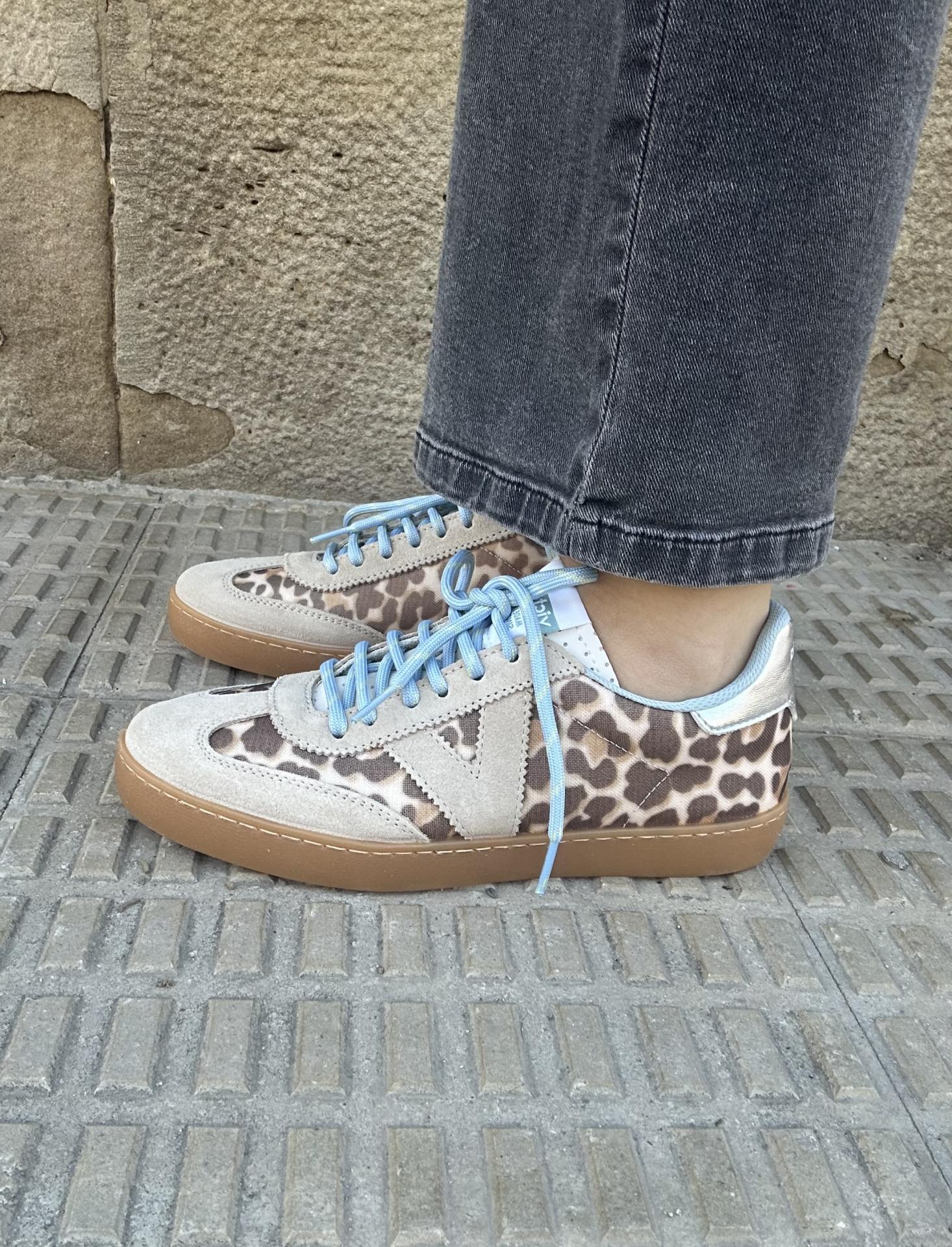 Zapatillas animal print para mujer fabricadas en España con piezas superpuestas de serraje al tono.