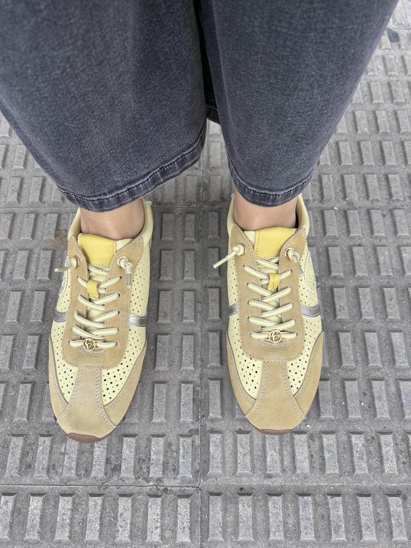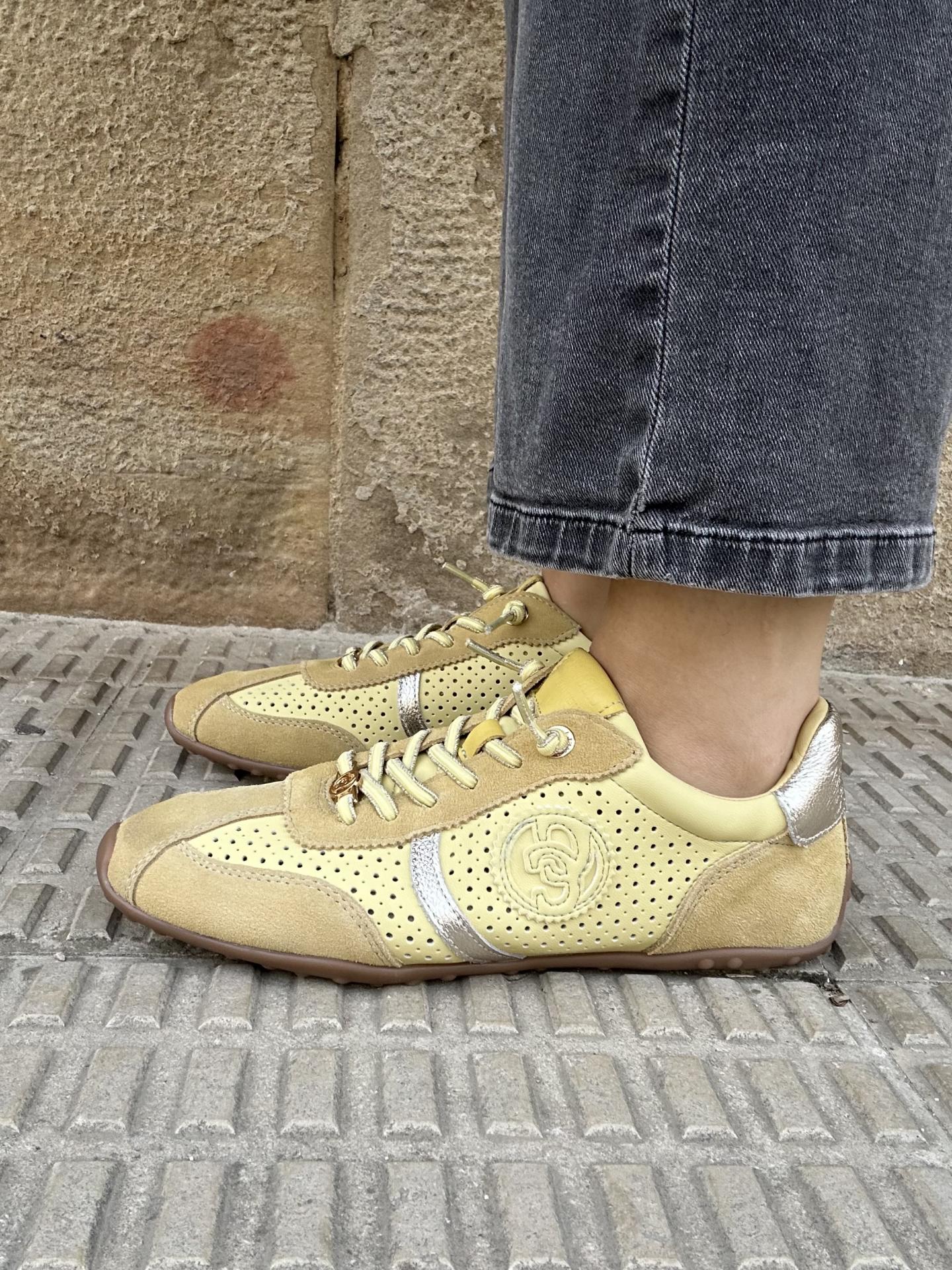 Zapatilla de mujer, marca Carmela fabricado en serraje color amarillo de alta calidad.