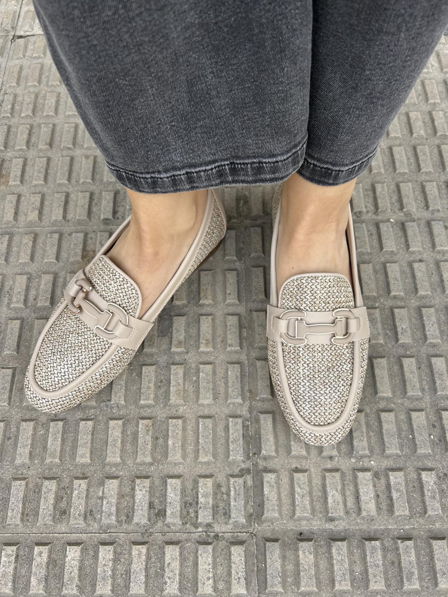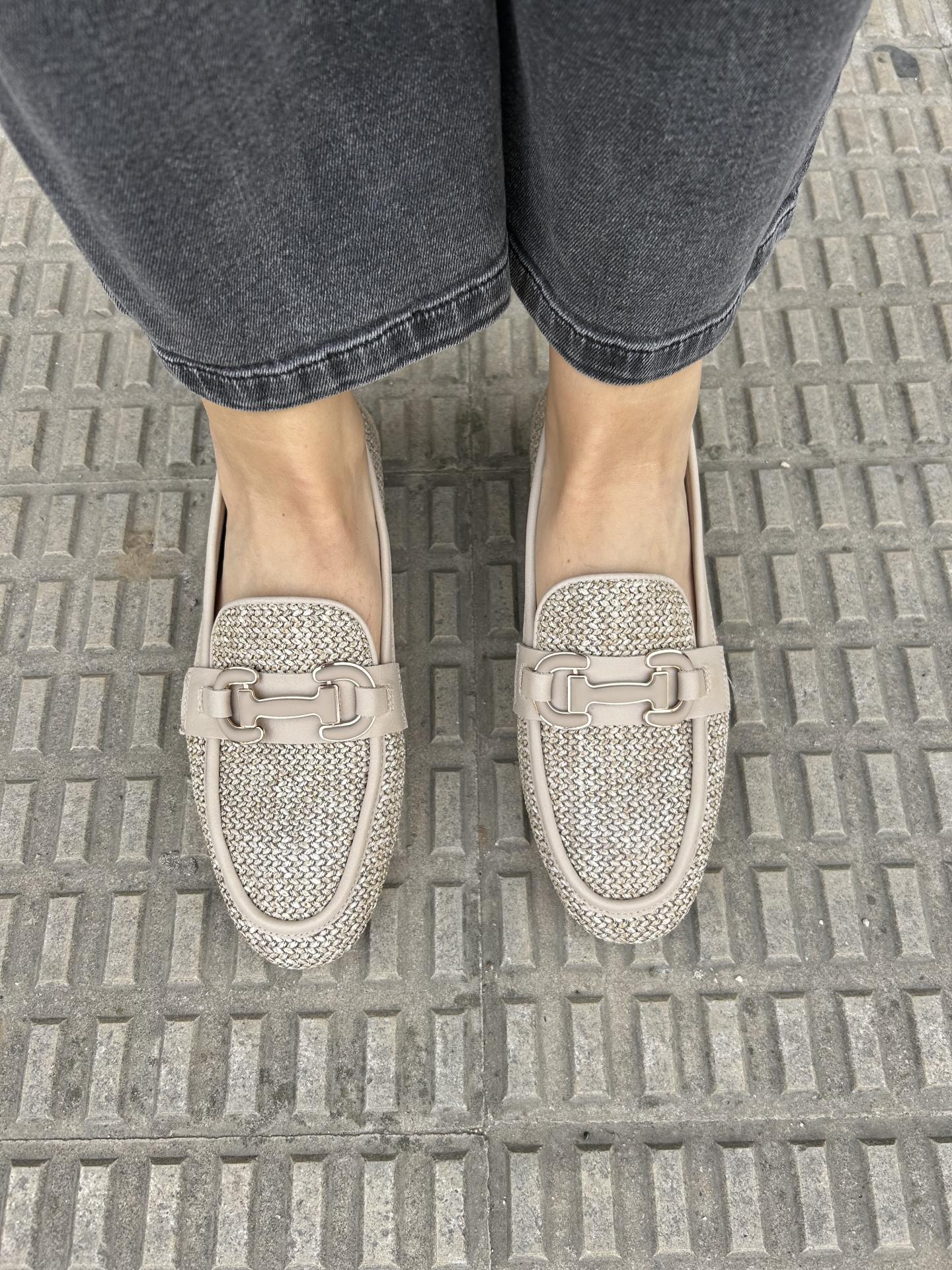 Estilo mocasín en color beige y diseño de rafia al tono con elemento decorativo al frente para proporcionar mayor elegancia. Suela antideslizante de goma y tapa tacon de 1,5cm.