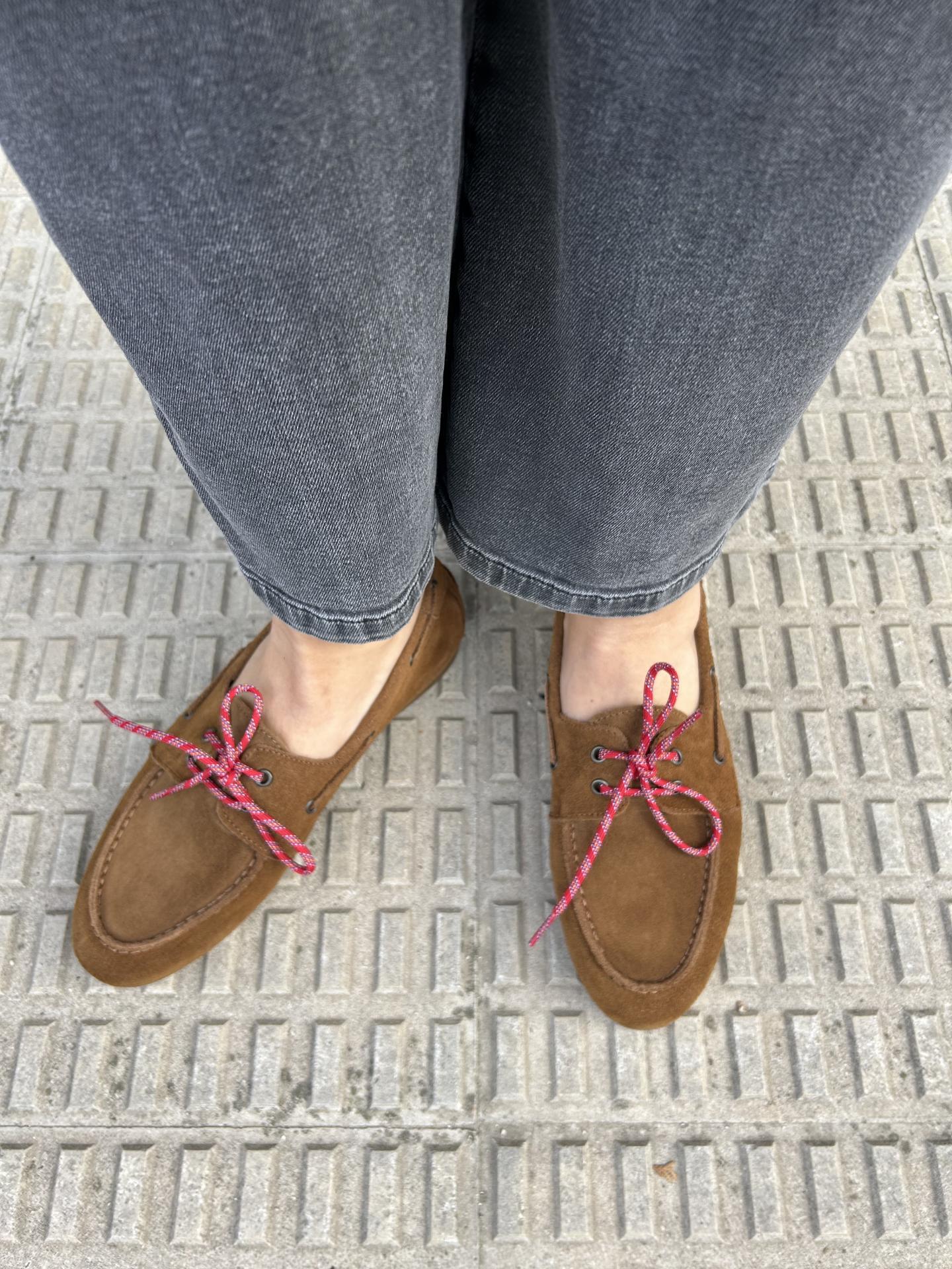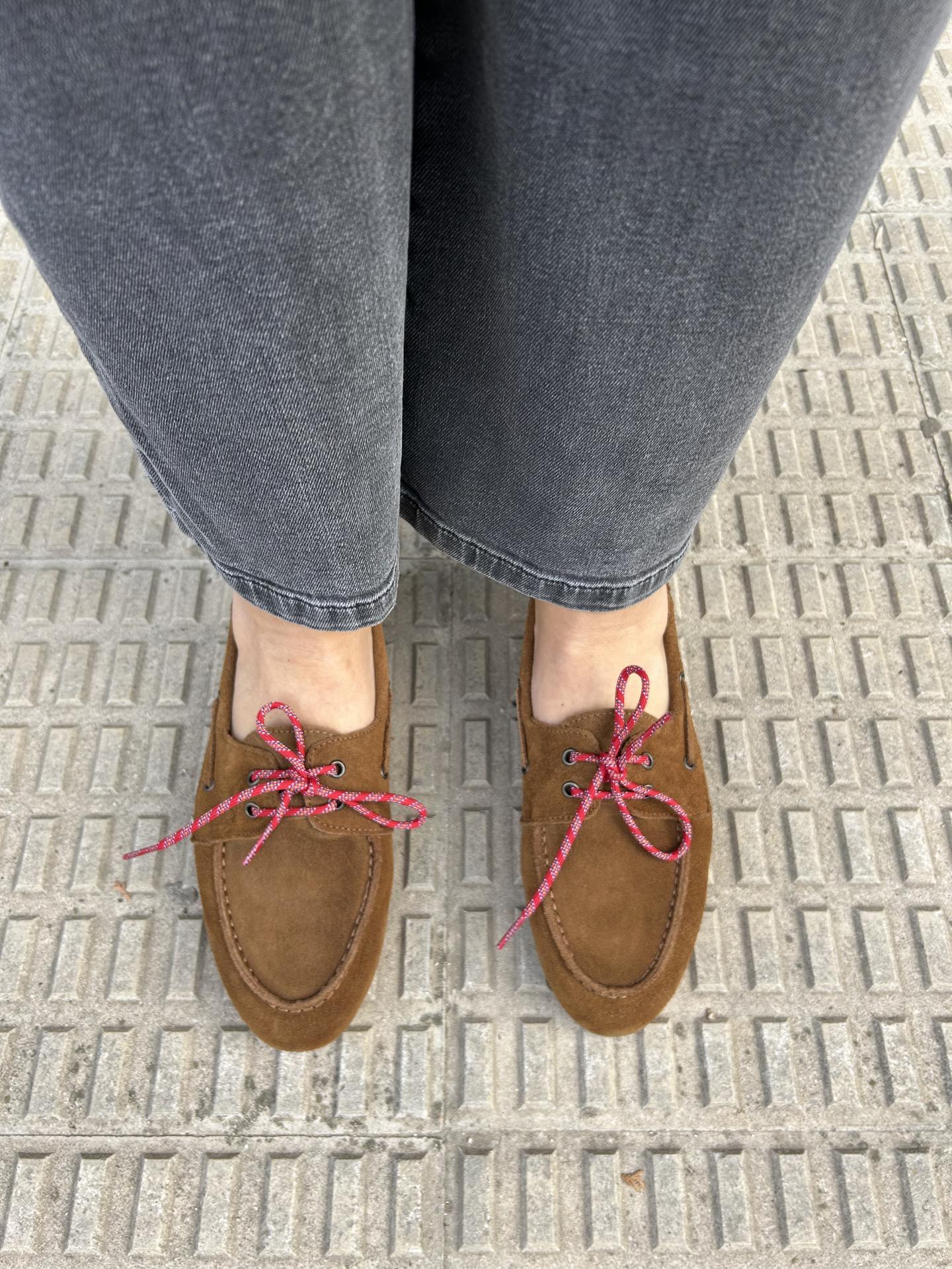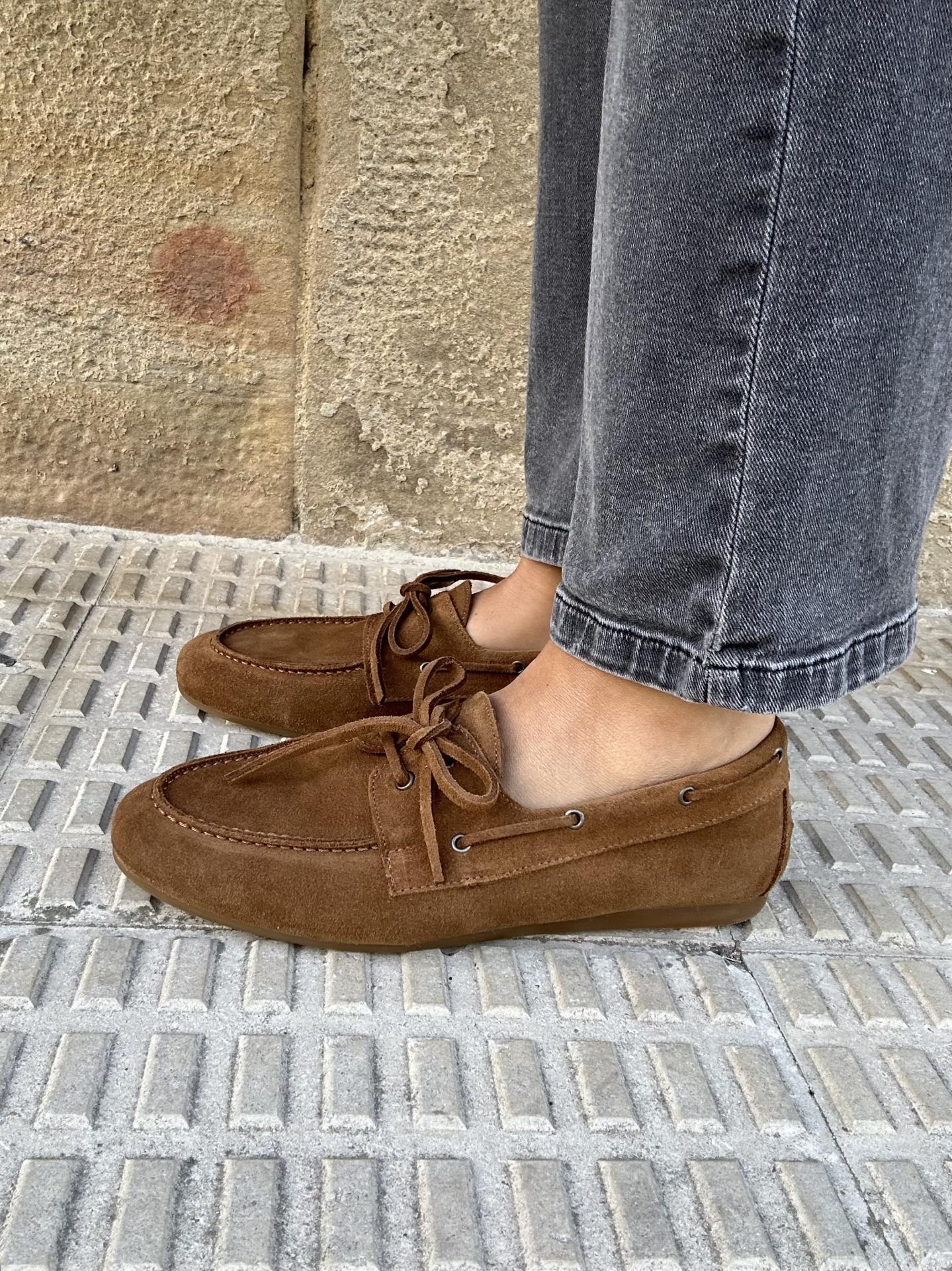 Mocasin de estilo nautico elaborado en serraje color camel. Suela flexible de goma y cuña en el talón para mayor comodidad. Cuentan con cordonera extra gratis.