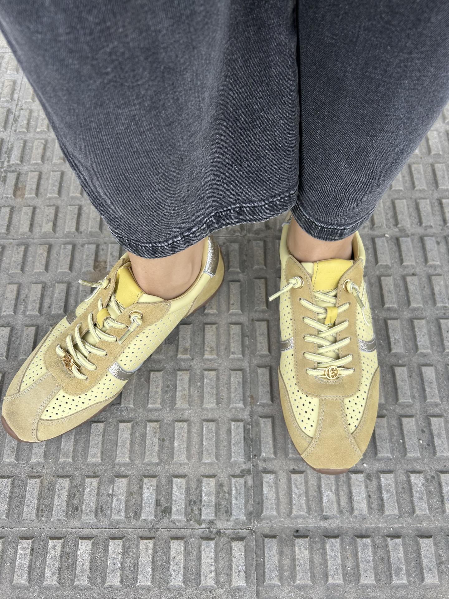 Zapatilla de mujer, marca Carmela fabricado en serraje color amarillo de alta calidad.