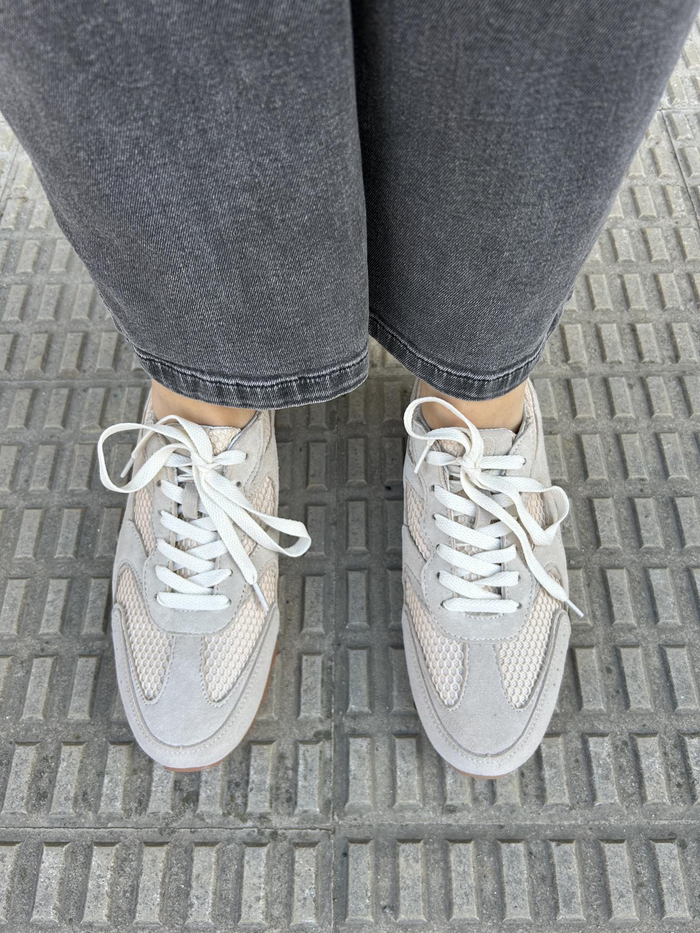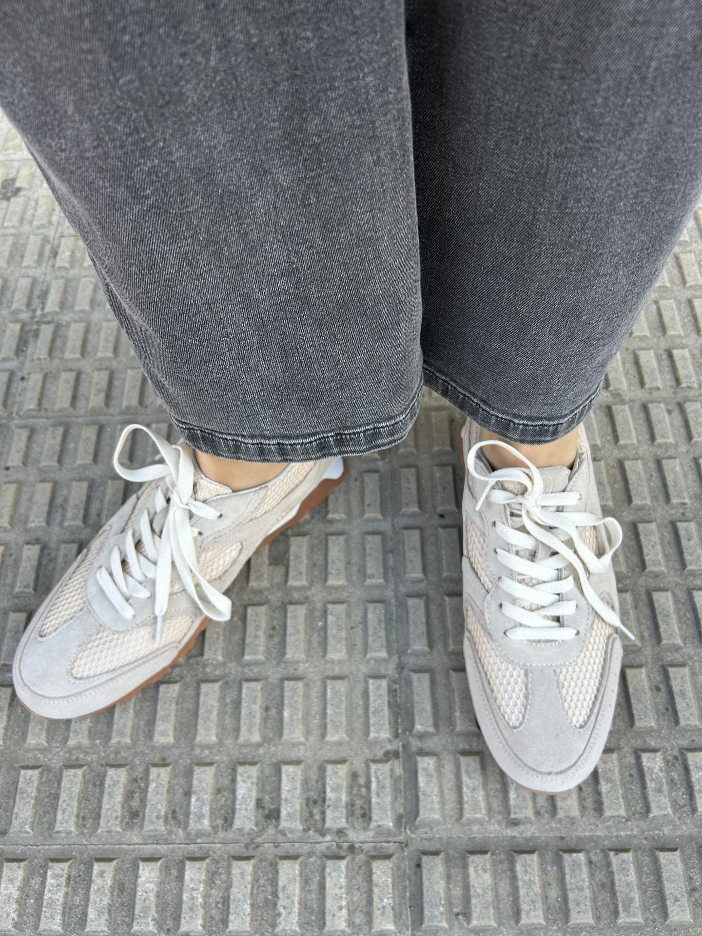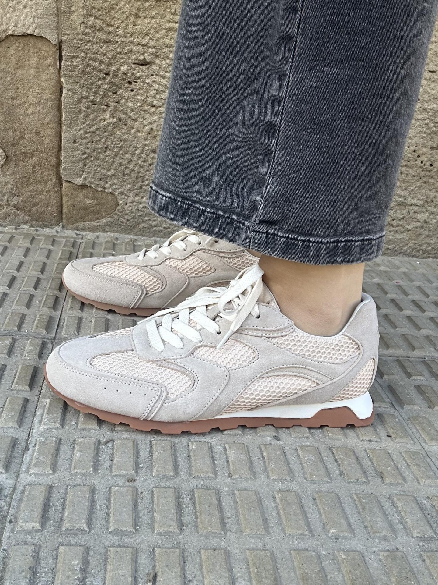 Zapatilla de mujer fabricada en serraje color hielo combinado en tejido de rejilla al tono.