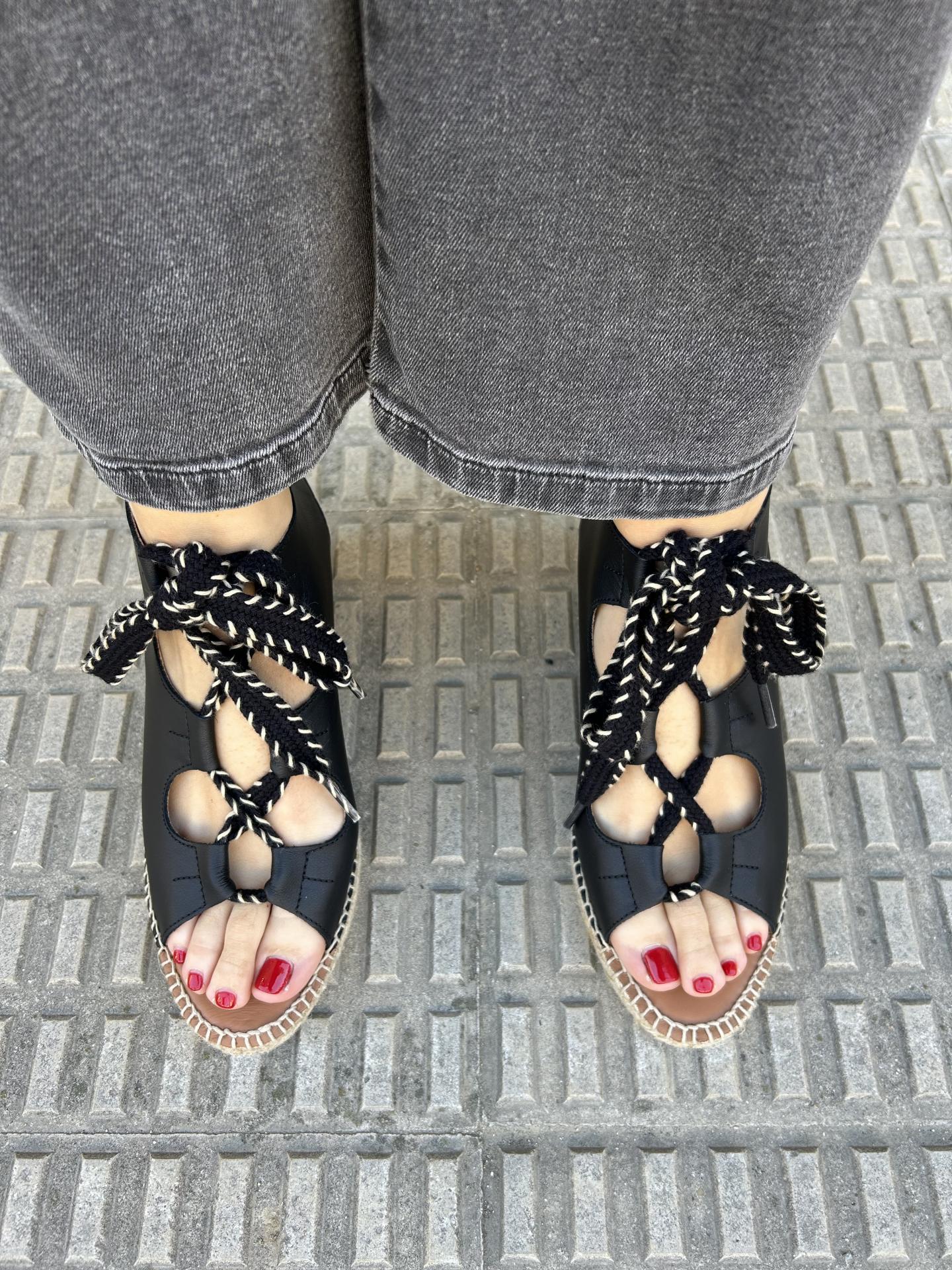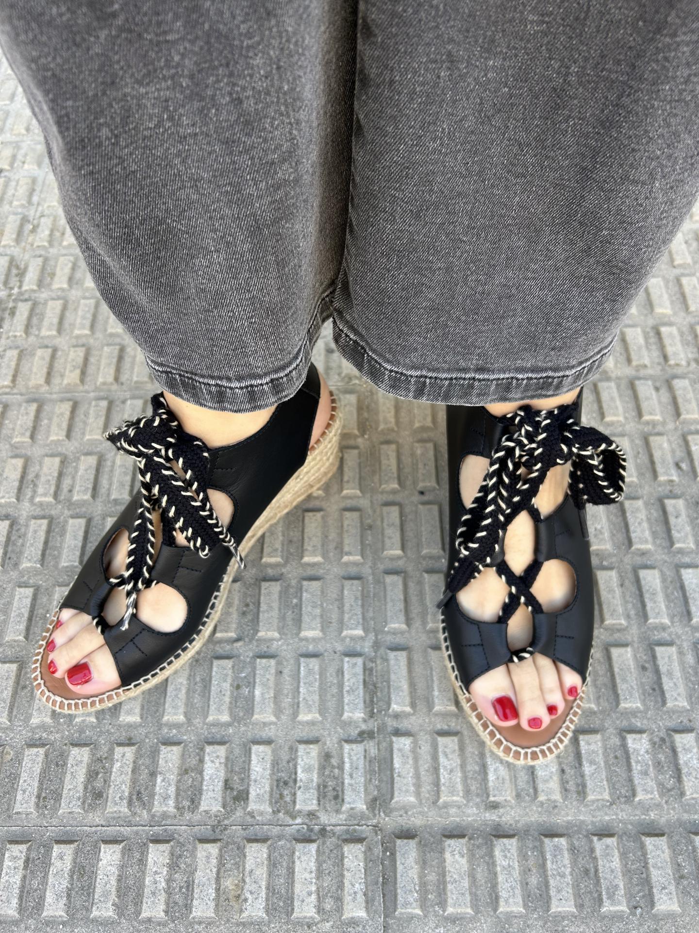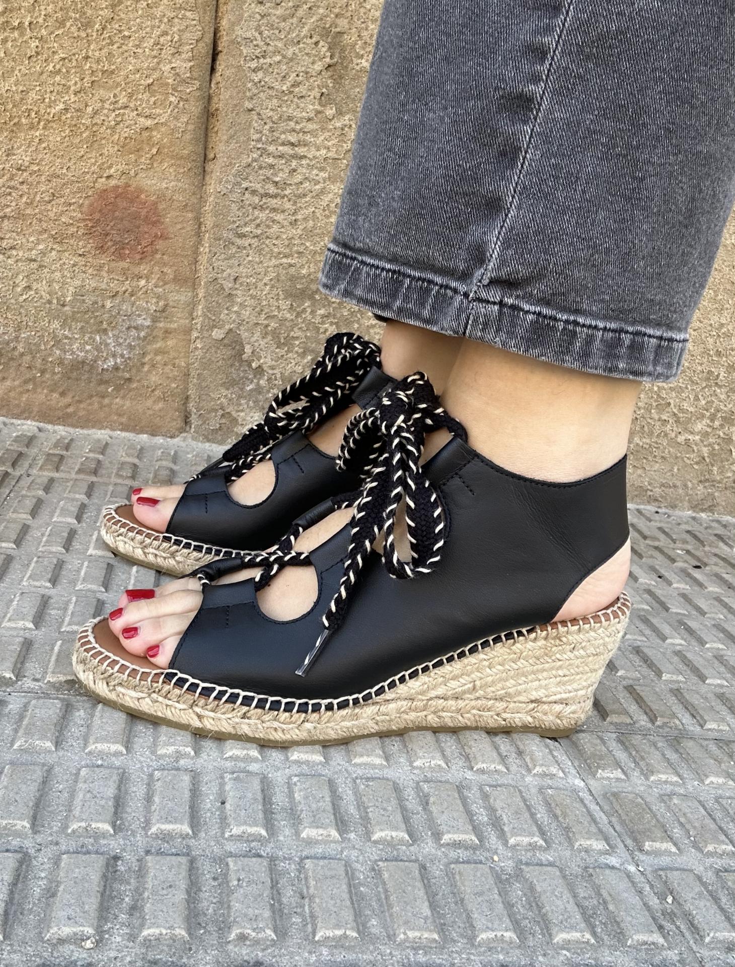Comodidad, durabilidad y versatilidad de un calzado 100% español.Alpargata de cuña de 7 cm, fabricada en piel negra de la mejor calidad y con plantilla de gel acolchada.