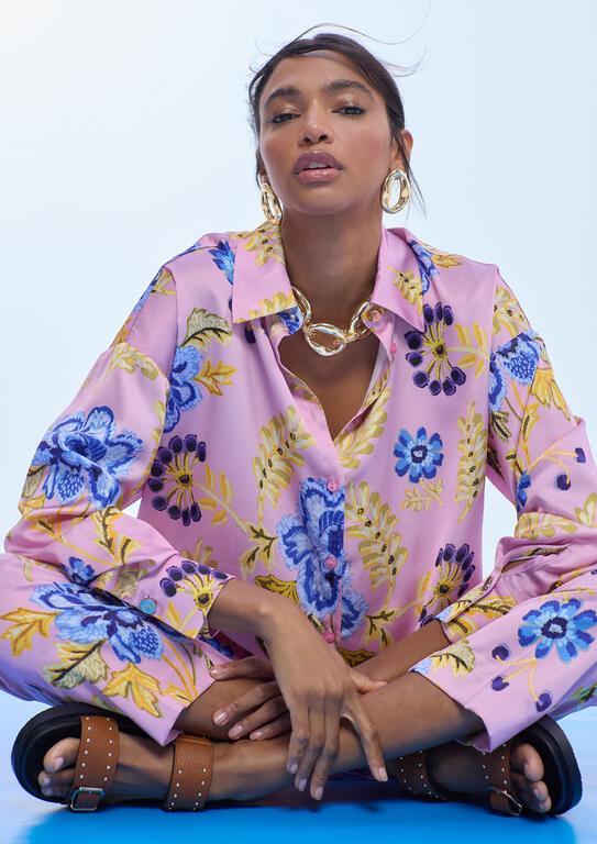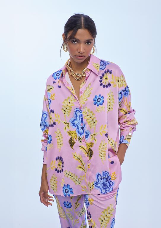 Camisa oversize confeccionada en satén con vibrante print floral. Suave al tacto, ofrece una caída elegante y un ajuste relajado. Mangas largas con puños ajustables y cuello clásico. Perfecta para añadir un toque de color a cualquier outfit.