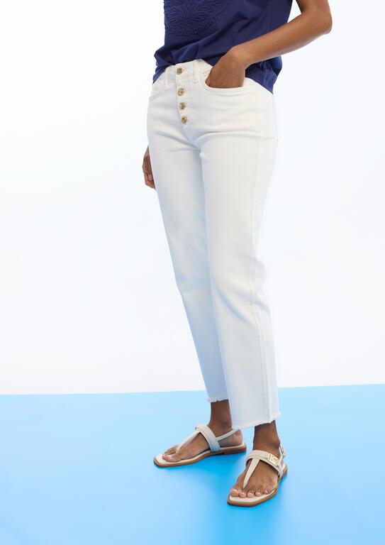 Pantalón de corte campanita en color blanco, confeccionado en tejido suave. Destacado por su botón frontal. Ideal para un look casual y fresco, con detalles deshilachados en el bajo.