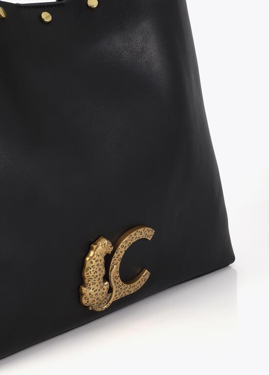 Bolso shopper con diseño elegante y logo metalizado. Decorado con tachas doradas y asa reforzada para mayor comodidad. Un complemento sofisticado para tu día a día.