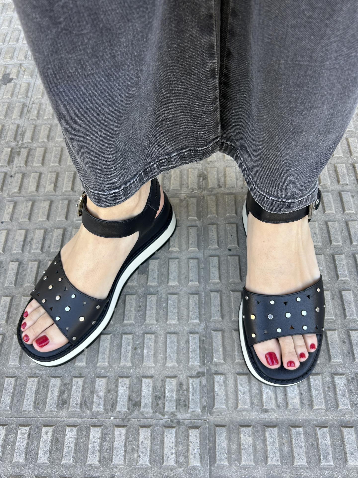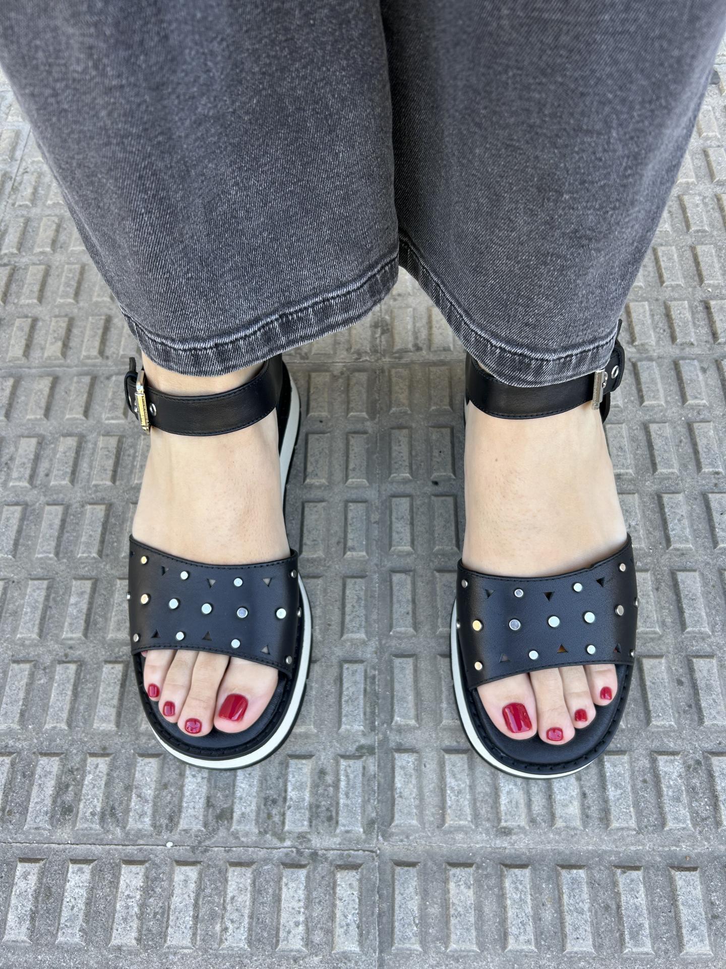Elaborada en piel color negro decorado con calados y apliques metálicos para darle mayor elegancia al modelo.