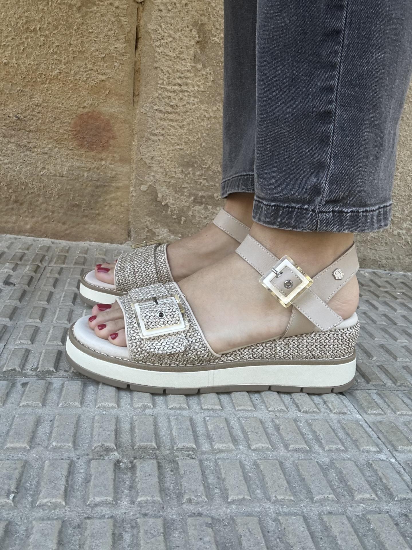 Cierre mediante hebilla ajustable en el tobillo para mayor sujeción. Suela con cuña forrada de 6cm de altura y 2cm de plataforma antideslizante.