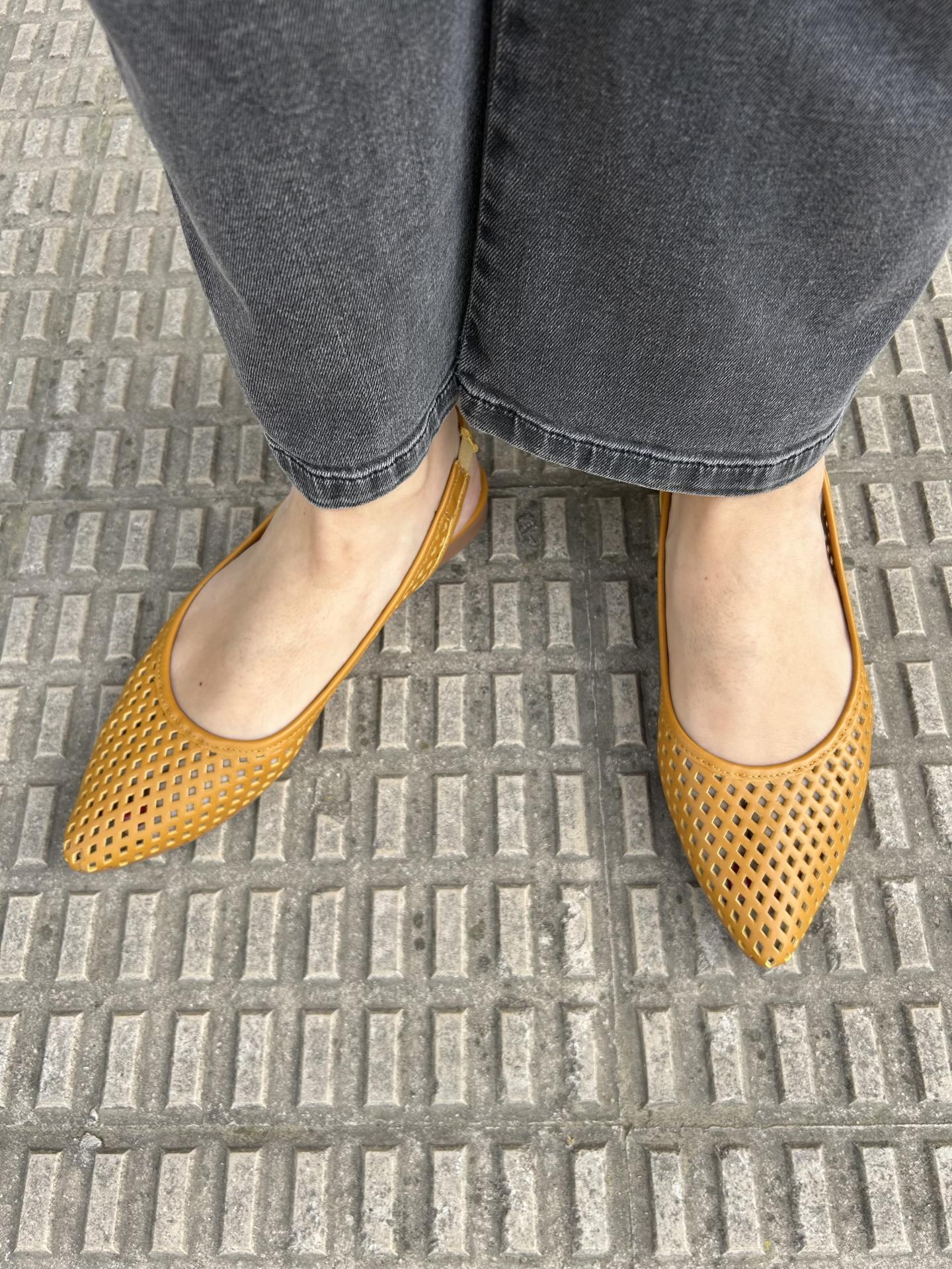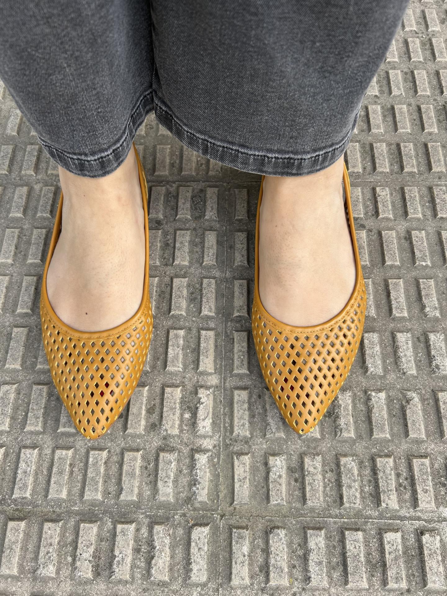 Bailarina destaponada de piel troquelada color mostaza ligeramente en punta.