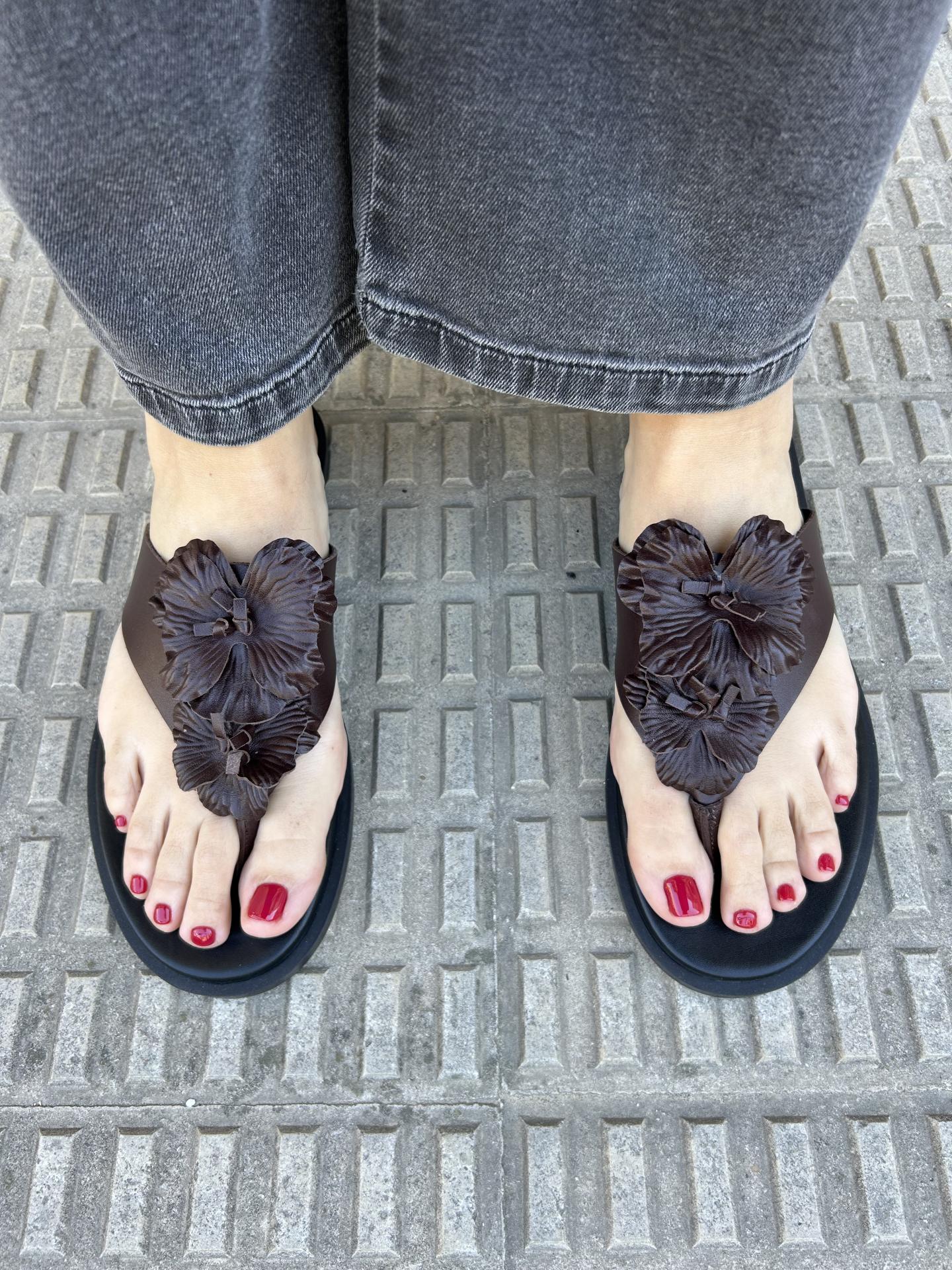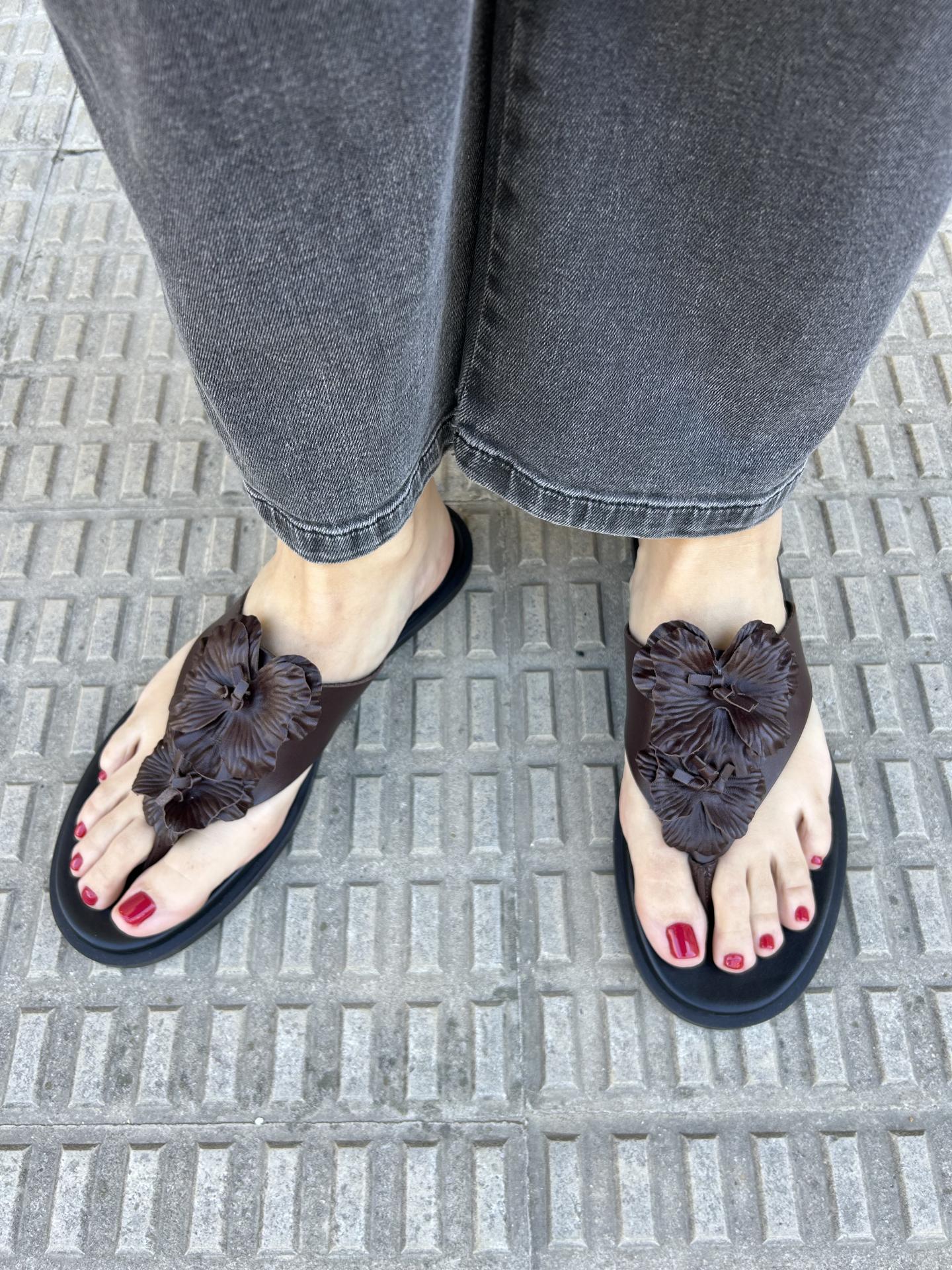 Elaborada en piel color marron con detalle de adorno de flor en el empeine.