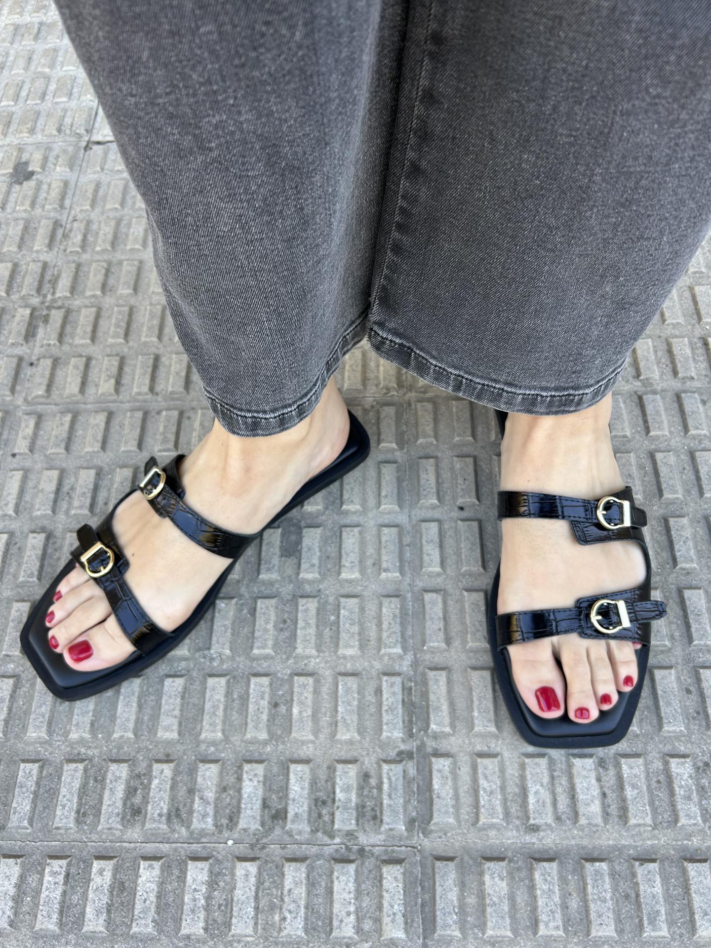 Elaborada en piel color negro con estampado de coco y detalle de dos hebillas