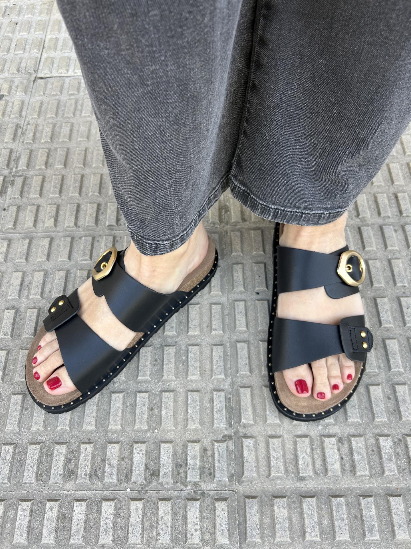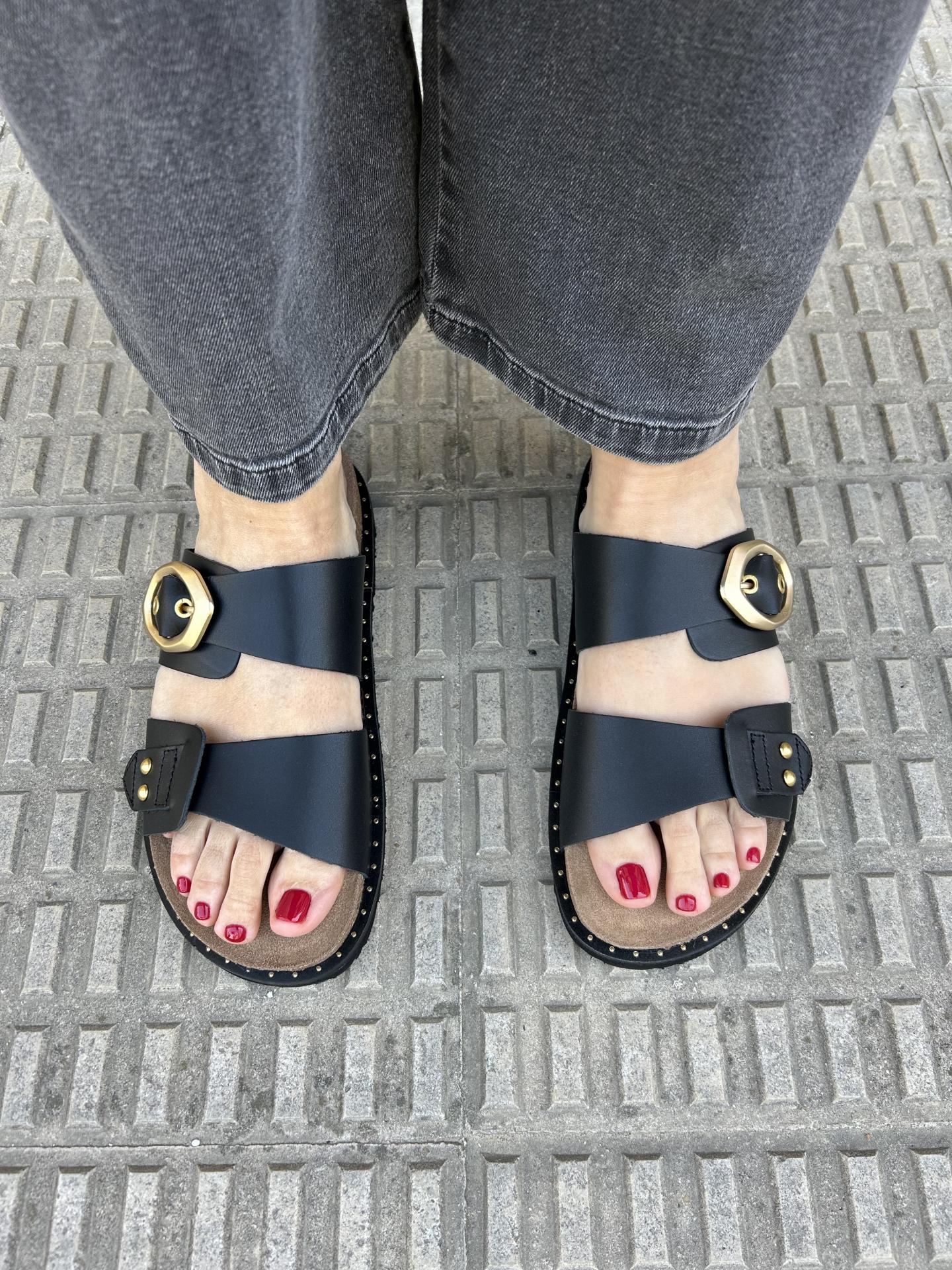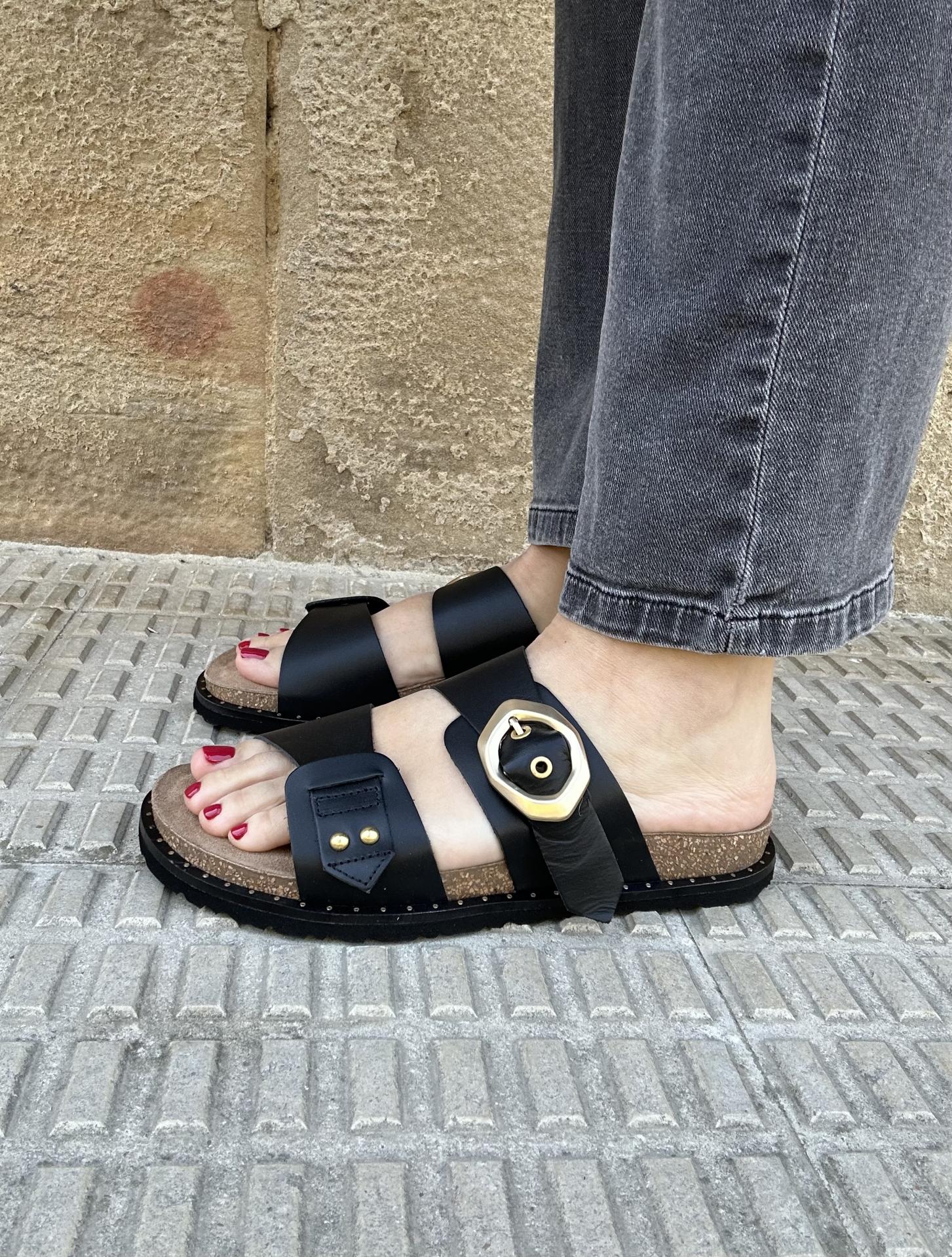 La sandalia plana Gia negro destaca por su diseño moderno con dos palas, siendo la pala superior la que cuenta con una hebilla asimétrica que aporta originalidad.